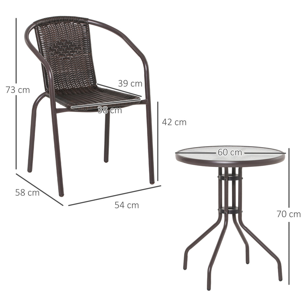 Il set da esterno porta un tocco di eleganza e comfort per i tuoi ambienti all'aperto. Solido e durevole, questo set composto da tavolino e 2 sedie da giardino ha una struttura in acciaio. Le sedie sono rivestite in rattan PE resistente e traspirante. Il tavolo da giardino ha il piano d'appoggio in vetro temperato, elegante e facile da pulire. Questo set tavolino con sedie da giardino resiste alle intemperie e ti assicura un utilizzo prolungato nel tempo per goderti l'aria aperta.