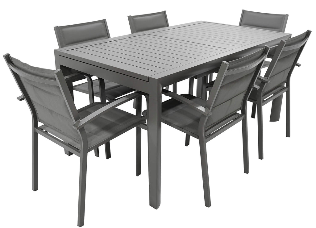 Dal Design semplice ed elegante il Set Completo Sugar è l'ideale per arredare il tuo giardino o il tuo terrazzo. Il Set comprende: un tavolo allungabile e 6 sedie. Il tavolo è realizzato in allumino, le sedie sono realizzate da una resistente struttura in alluminio e con textilene imbottito. Grazie all'alta qualità dei materiali ha un elevata resistenza alle intemperie e agli agenti atmosferici garantendo una durata a lungo termine. Con sistema di bloccaggio per una maggiore stabilità quando il tavolo viene allungato.