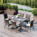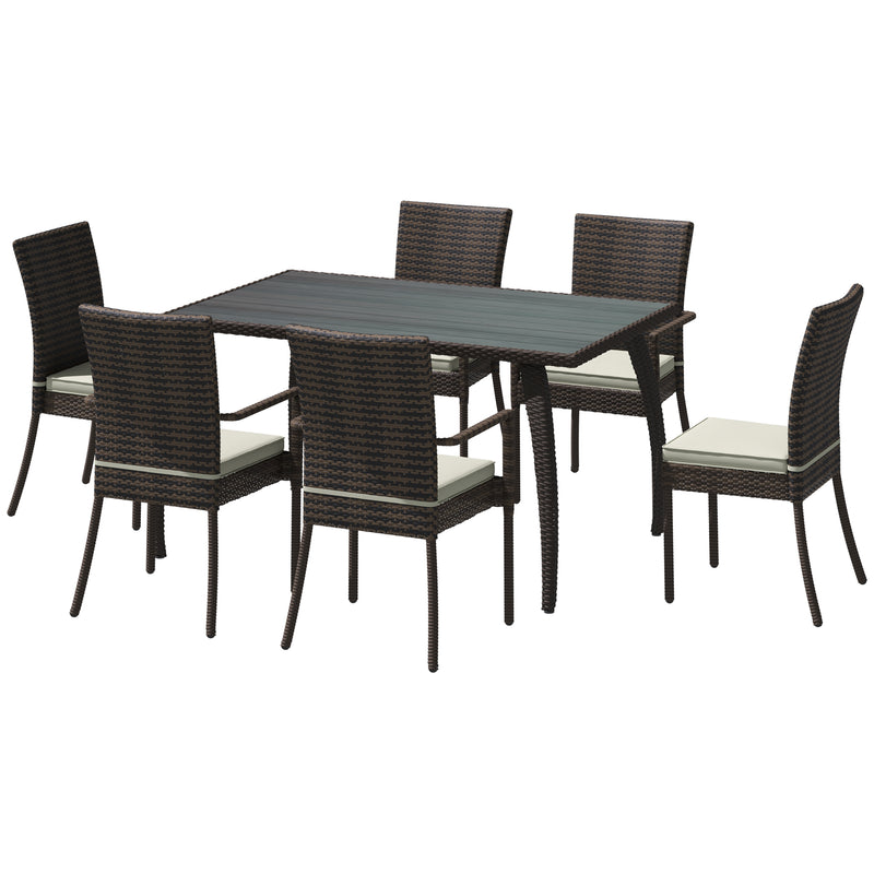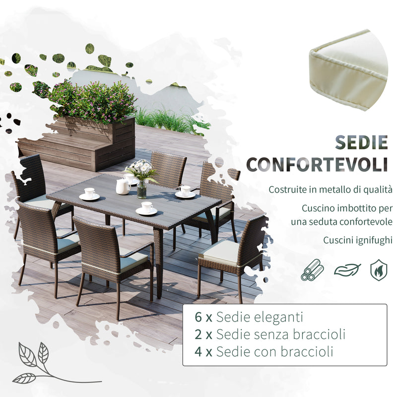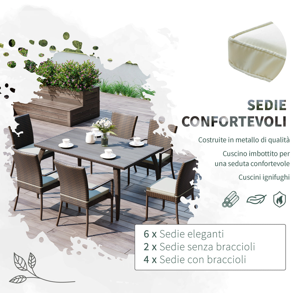 Set Tavolo e 6 Sedie da giardino in Legno e Rattan Sintetico con Cuscini Marrone