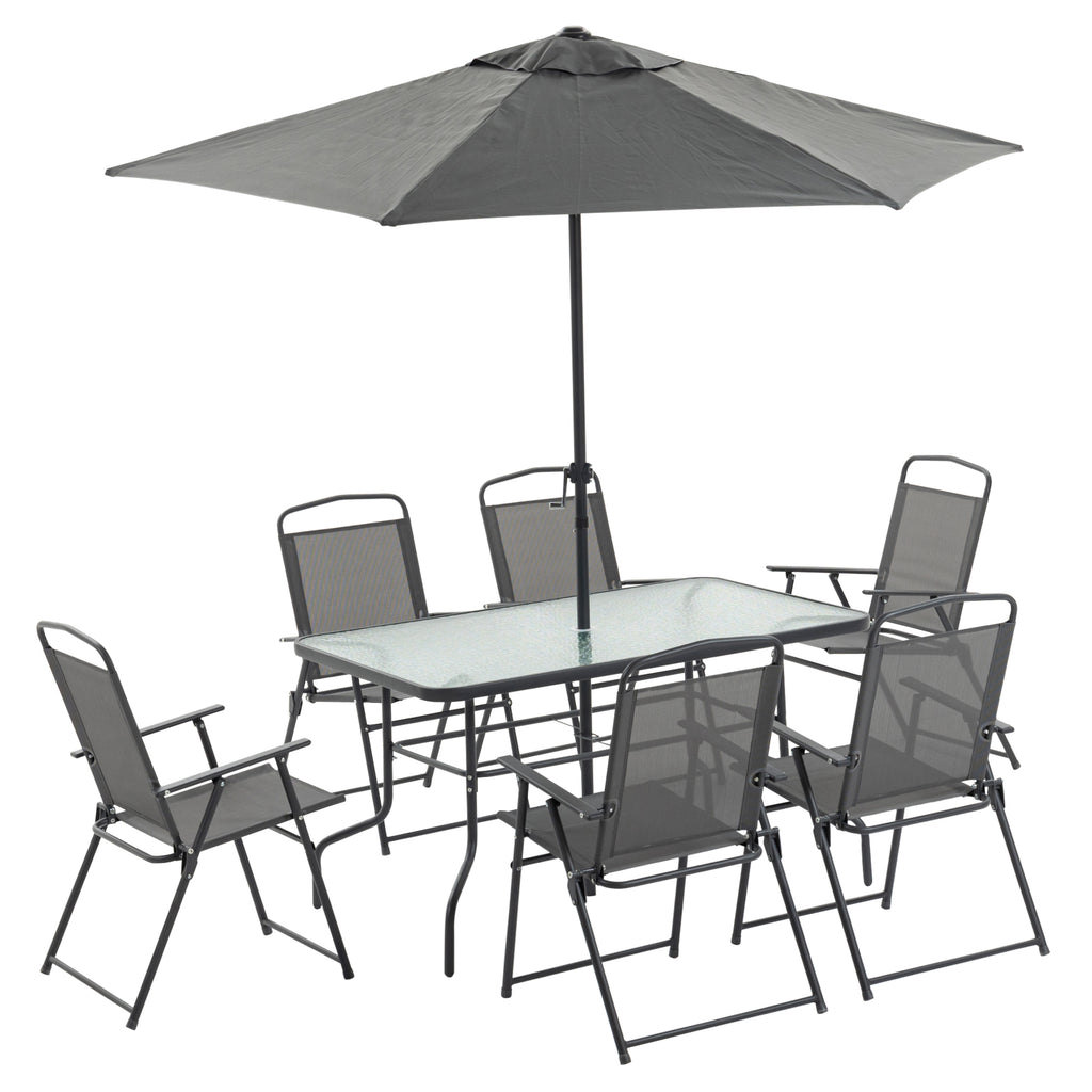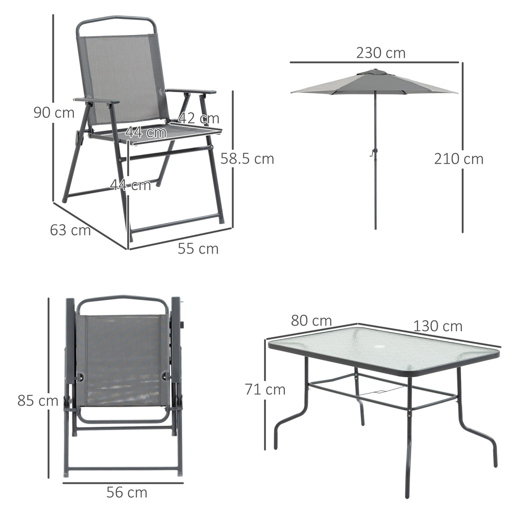 Set Tavolo e 6 Sedie Pieghevoli da Giardino con Ombrellone Piano in Vetro e Sedute in Tessuto Grigio
