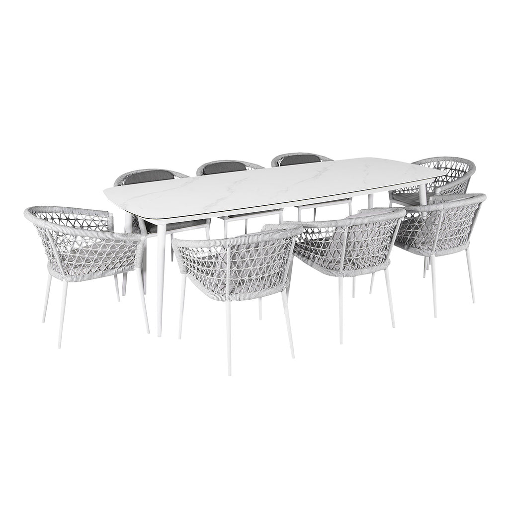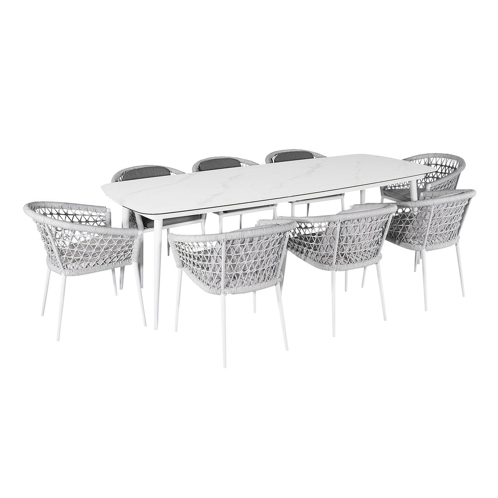 Immagina il Set Muses 240: un tavolo rettangolare con struttura in alluminio verniciato a polvere bianco e piano in pietra sintetica bianca, affiancato da otto sedie con braccioli. Le sedie presentano una struttura in alluminio, rivestimento in corda di poliestere bianca e cuscini in Olefina dal tessuto morbido e resistente. Un insieme spazioso e elegante per gli ambienti all'aperto.