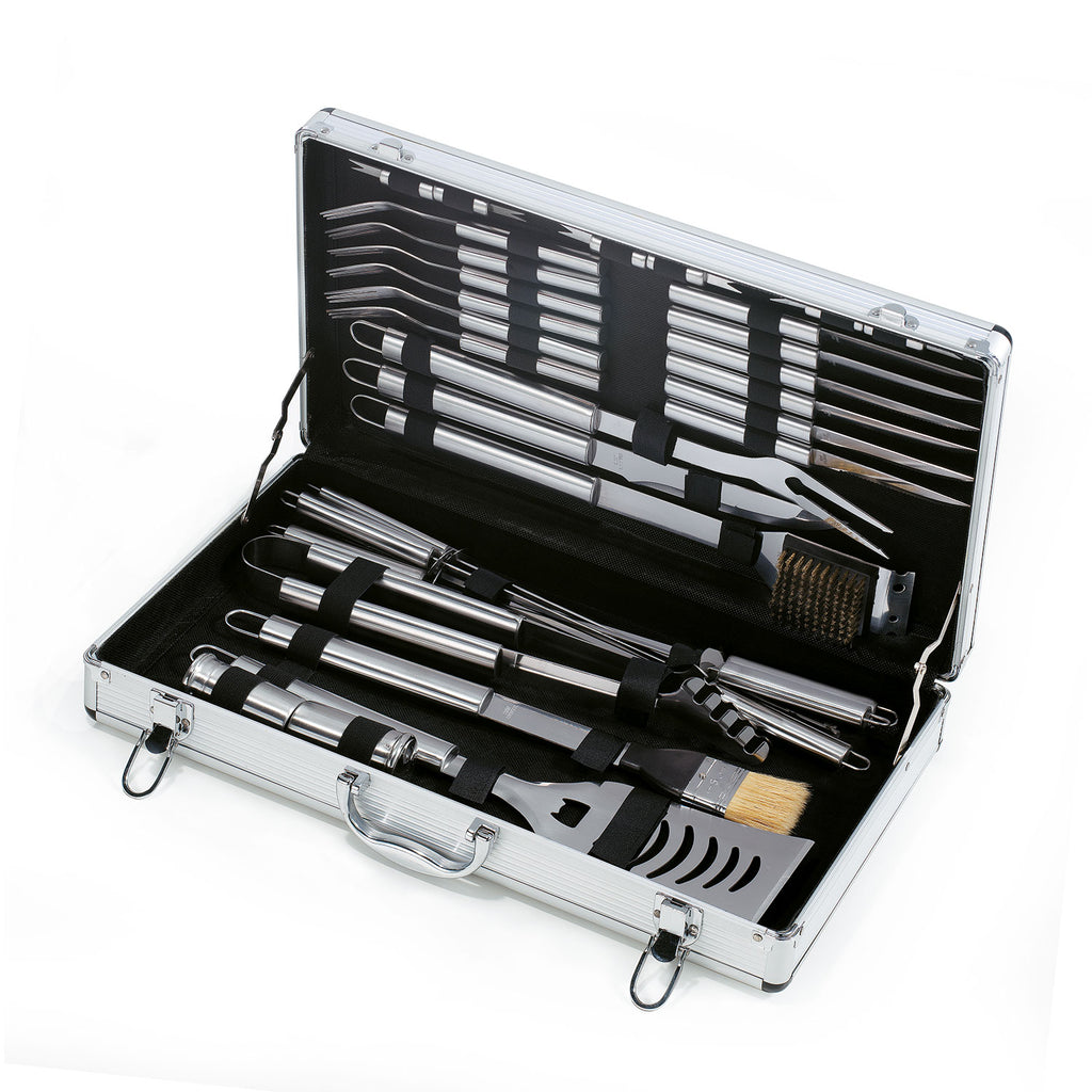 Set valigetta in alluminio da 32 pezzi in acciaio inox. Contiene: 6 coltelli, 6 forchette, 6 forchettine, forchettone, paletta, 6 spiedini, pinza, porta sale, porta pepe, coltello, pennello per ungere, spazzola pulisci-griglia.