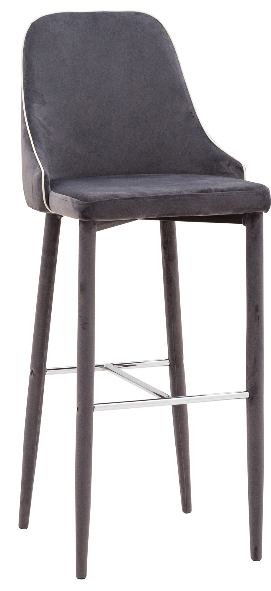 Sgabello con struttura in metallo tubolare, seduta e schienale con imbottitura in poliuretano e rivestimento in tessuto vellutato con cordino di profilatura in similpelle bianca. Poggiapiedi in metallo cromato.