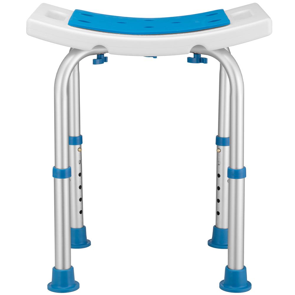 Sedile da doccia regolabile in altezza con seduta antiscivolo dotata di fori per il deflusso dell'acqua.