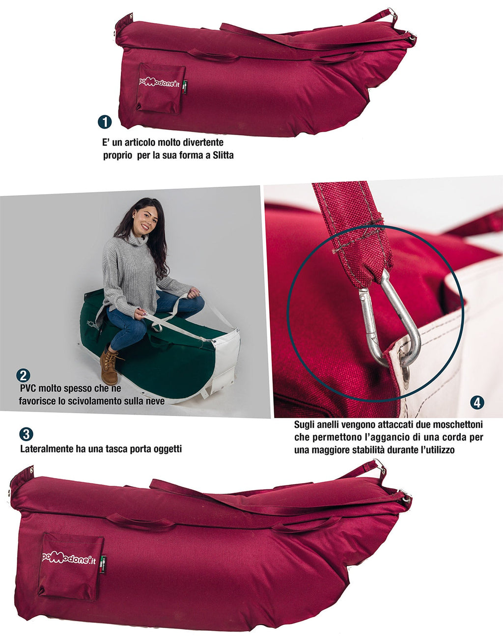 Concepite per grandi e piccini le slitte da neve Pomodone porteranno l'allegria sulle vostre piste facendo tornare gli adulti indietro negl'anni e sentire i bambini provetti avventurieri di montagna.