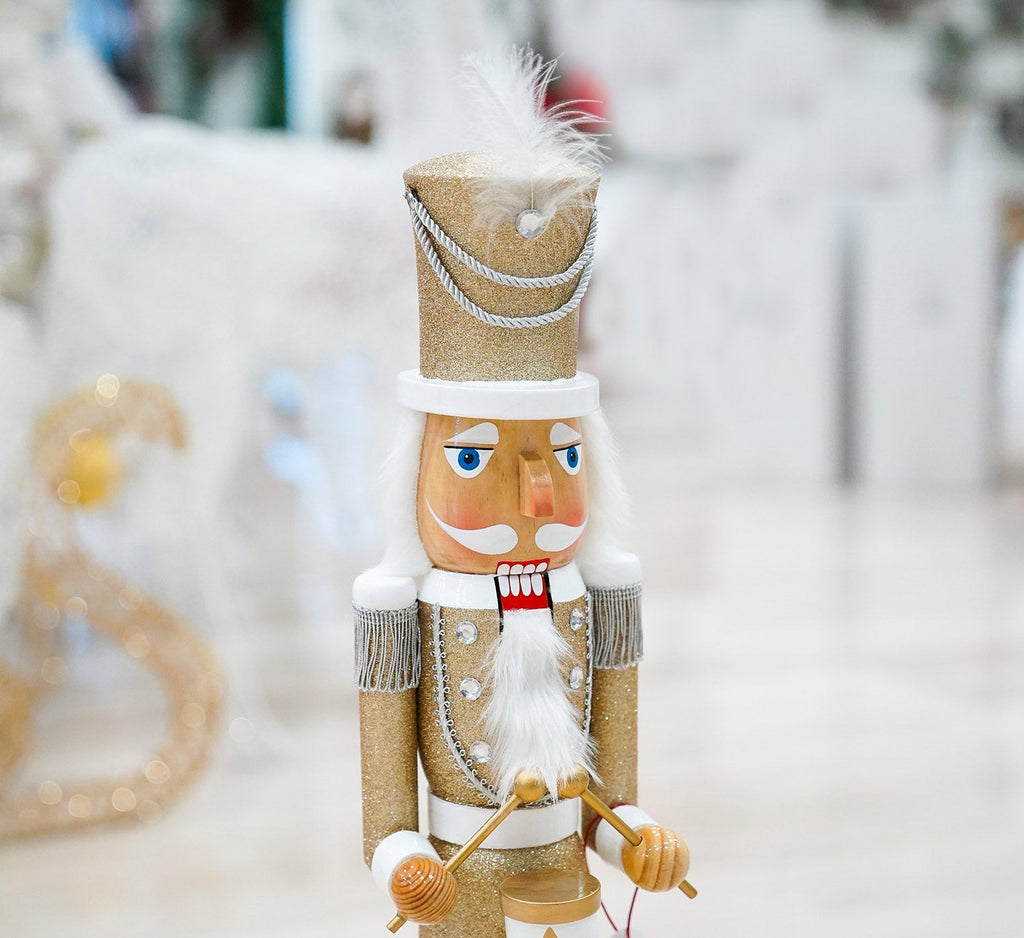 Schiaccianoci natalizio realizzato in legno, dipinto a mano brillantinato oro con tamburo.