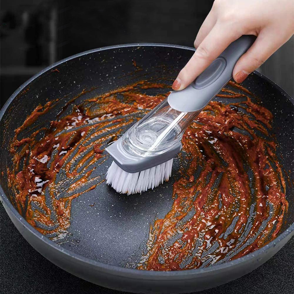 Una valida alleata per la pulizia delle stoviglie: la pratica spazzola con dispenser integrato di sapone ti permetterà di scrostare piatti e pentole con estrema facilità.