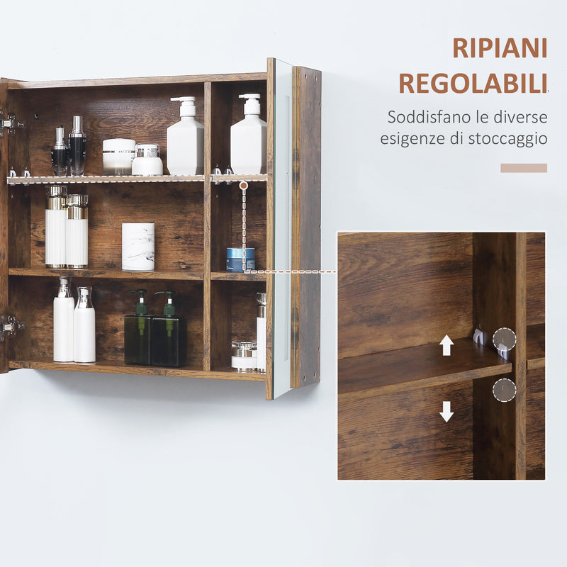 Specchiera Bagno con Luci LED Regolabili 70x15x65 cm 2 Ante e Mensola Regolabile Marrone