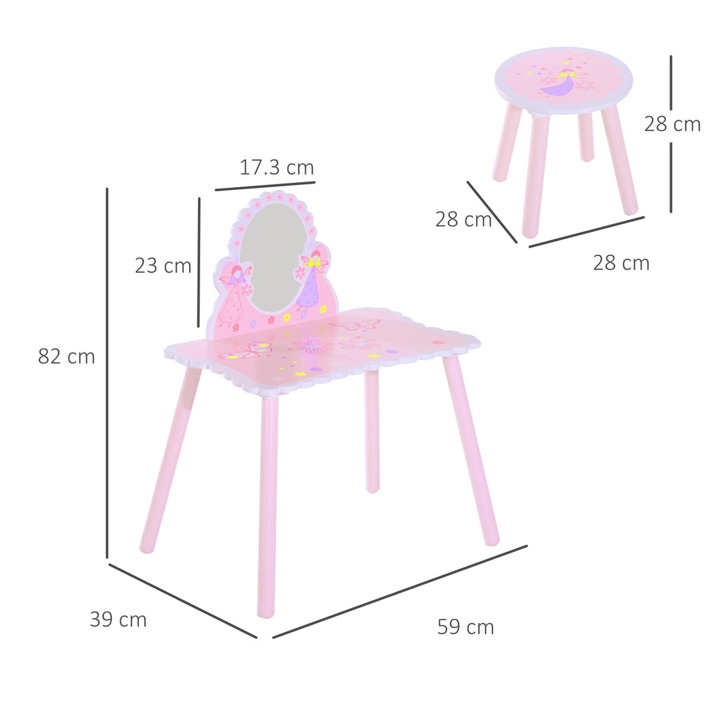Salone di bellezza per bambine composto da un tavolino con specchio e uno sgabello. Rendi felice la tua bambina con questa bellissima toeletta con cui potrà specchiarsi, pettinarsi e giocare come una vera principessa.
