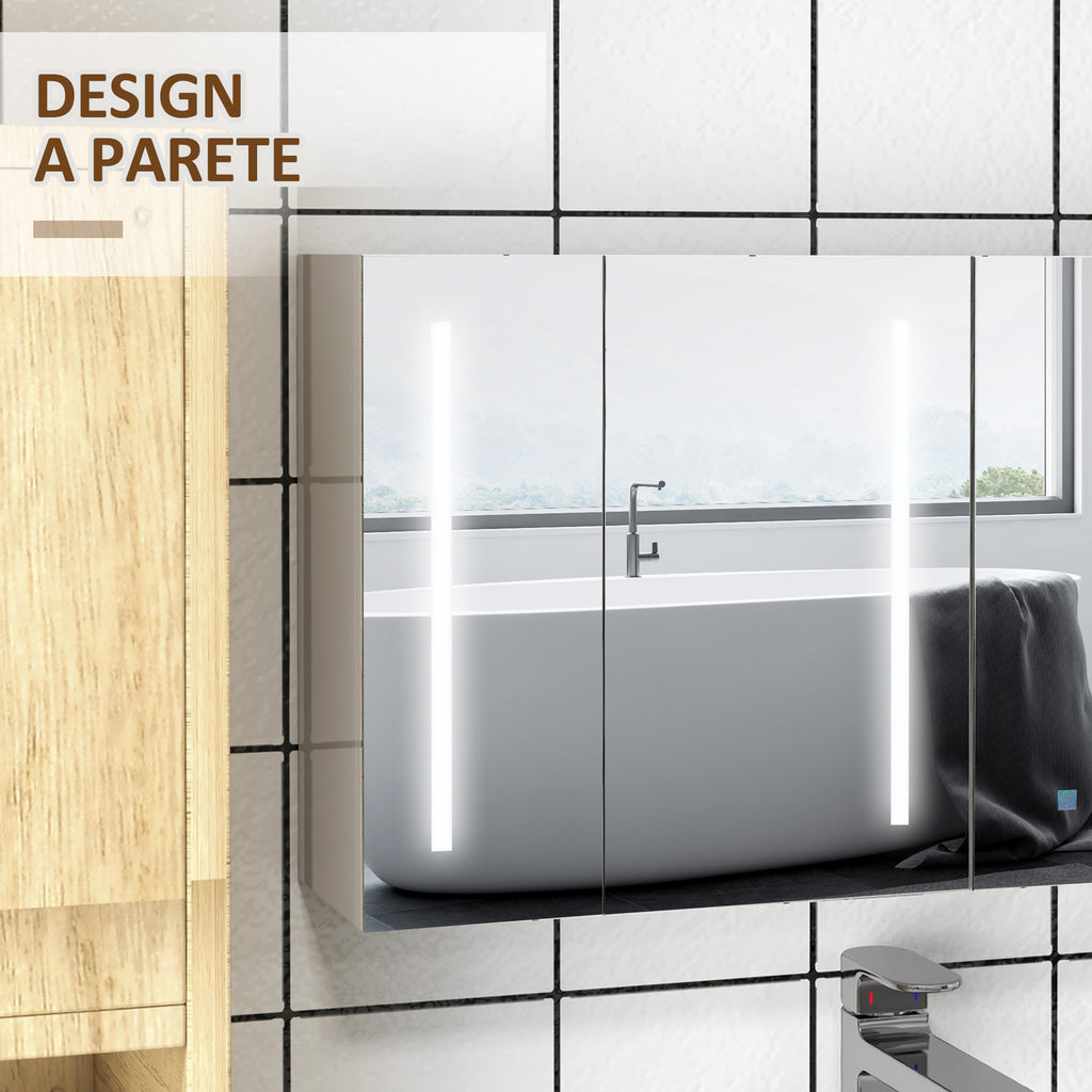 La divisione a 3 sezioni dell'armadietto a specchio permette di dividere lo spazio in zone ben distinte con le ante a disposizione. Il ripiano superiore è regolabile, in modo da poter personalizzare l'altezza del ripiano in base alle tue esigenze di spazio e oggetti. Il montaggio è a parete per risparmiare spazio a terra.