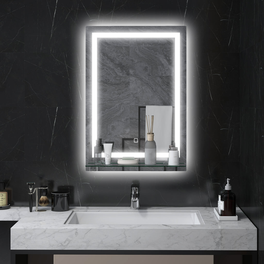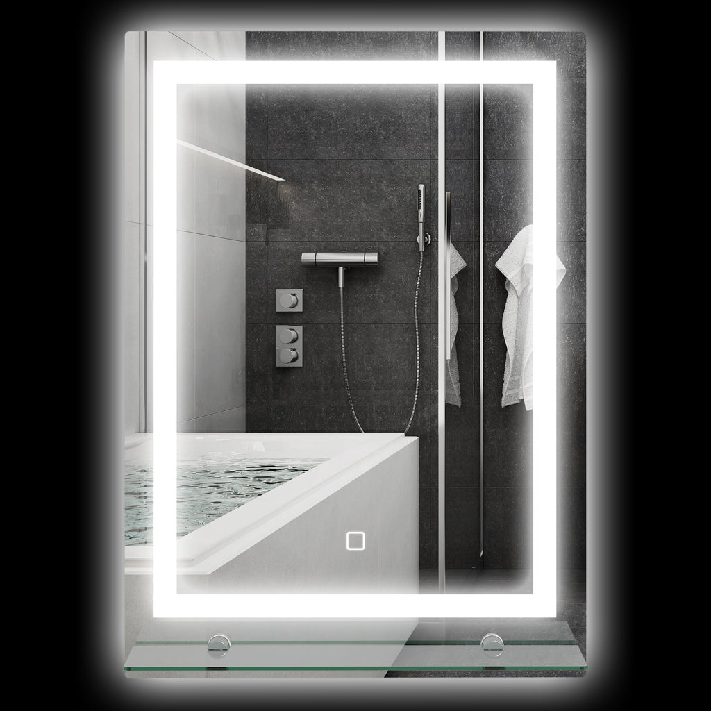 Un bagno moderno unisce design e tecnologia per un risultato di qualità. Gli accessori minimalisti e funzionali, come questo specchio per bagno con illuminazione LED e interruttore touch, si caratterizzano per il basso consumo energetico. Realizzato con una struttura in alluminio antiruggine e una pratica mensola in vetro per organizzare accessori da bagno, il nostro specchio con luci può essere facilmente montato a muro grazie agli accessori inclusi per l'installazione.