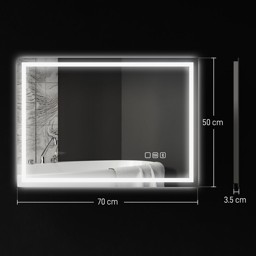 Specchio Bagno da Parete LED Antiappannamento 50x70 cm Speaker Bluetooth e Pulsanti Touch in Vetro Temperato