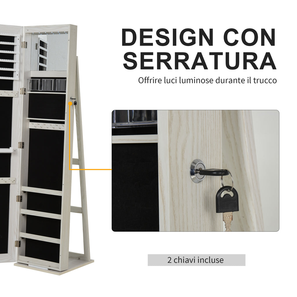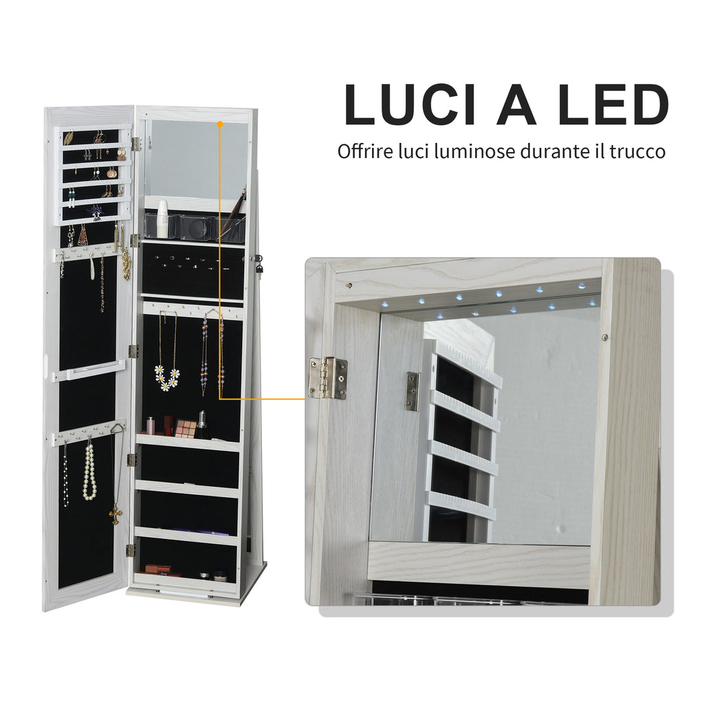 Specchio Portagioie da Terra a LED 15x15x61,75 cm con 4 Scaffali Struttura in Legno Bianco