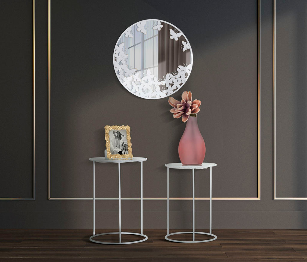 Specchio rotondo in metallo bianco con eleganti farfalle decorative con profili dorati. Gli specchi sono un elemento indispensabile per conferire luminosità ad un arredo glamour. Allargano otticamente gli spazi e creano un sofisticato punto luce.