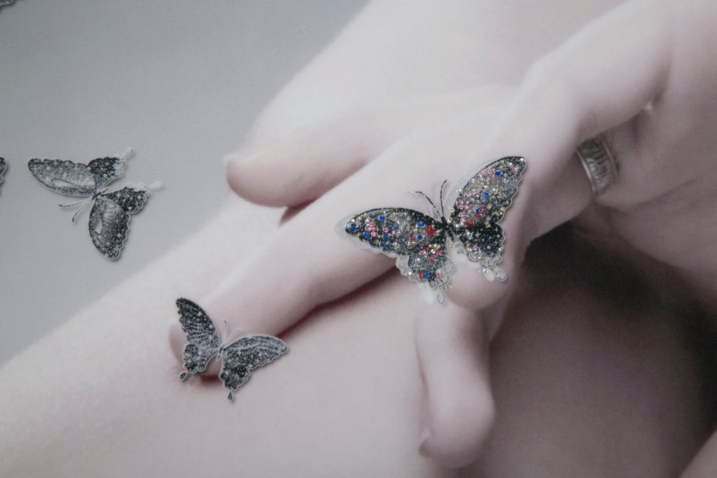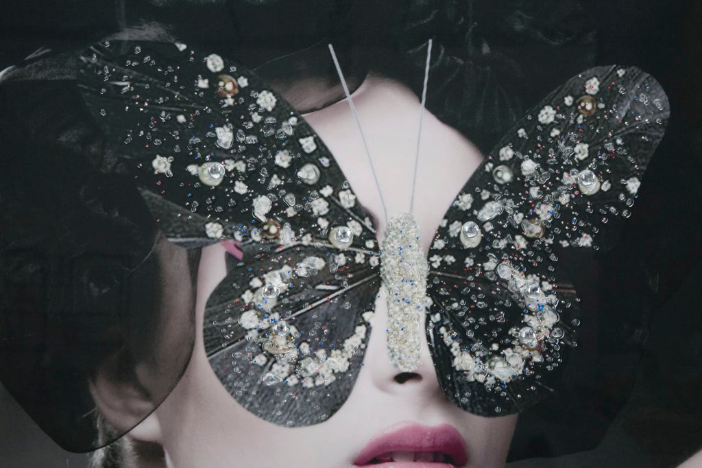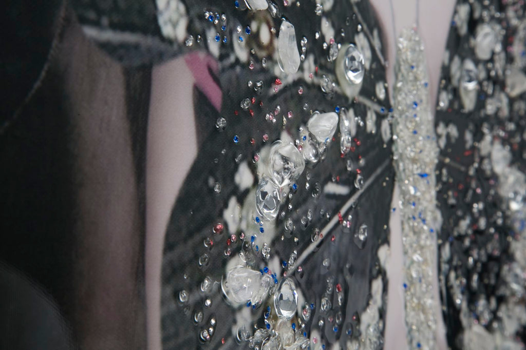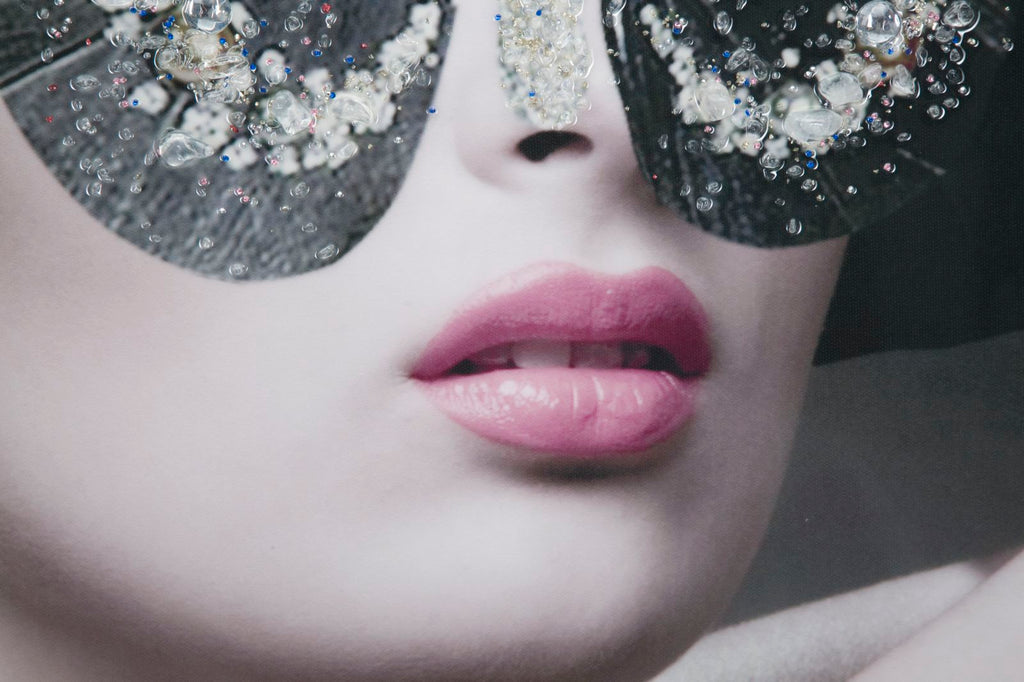 Stampa su tela con telaio in legno. Figure femminili misteriose e seducenti impreziosite da applicazioni glitterate. Elementi glamour e moderni per le pareti di casa
