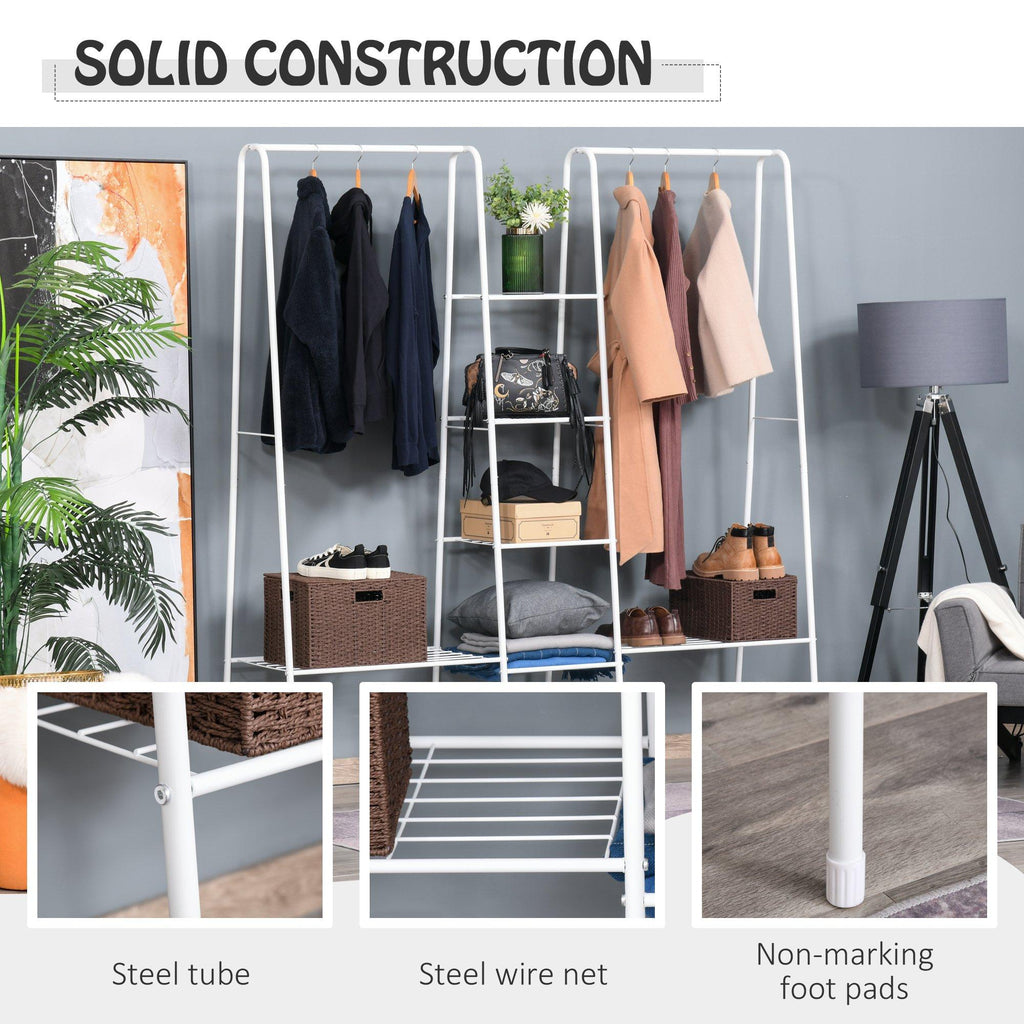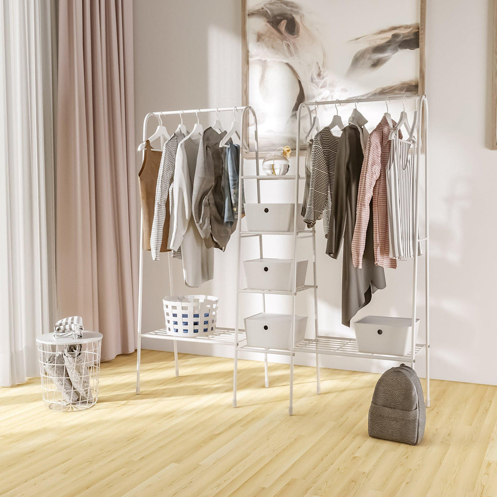 Lo stand appendi abiti è una soluzione funzionale per ampliare gli spazi in cui riporre i tuoi vestiti e cappotti. È dotato di due aste appendi abiti e 4 mensole centrali, per offrirti tutto lo spazio di cui hai bisogno per tenere in ordine vestiti e oggetti. Ideale per la camera da letto, l'ingresso, la lavanderia e tanti altri spazi. La rella per abiti è dotata di piedini antigraffio, per proteggere le tue superfici da segni o eventuali danni, e ha una struttura solida e stabile per durare a lungo nel tempo.