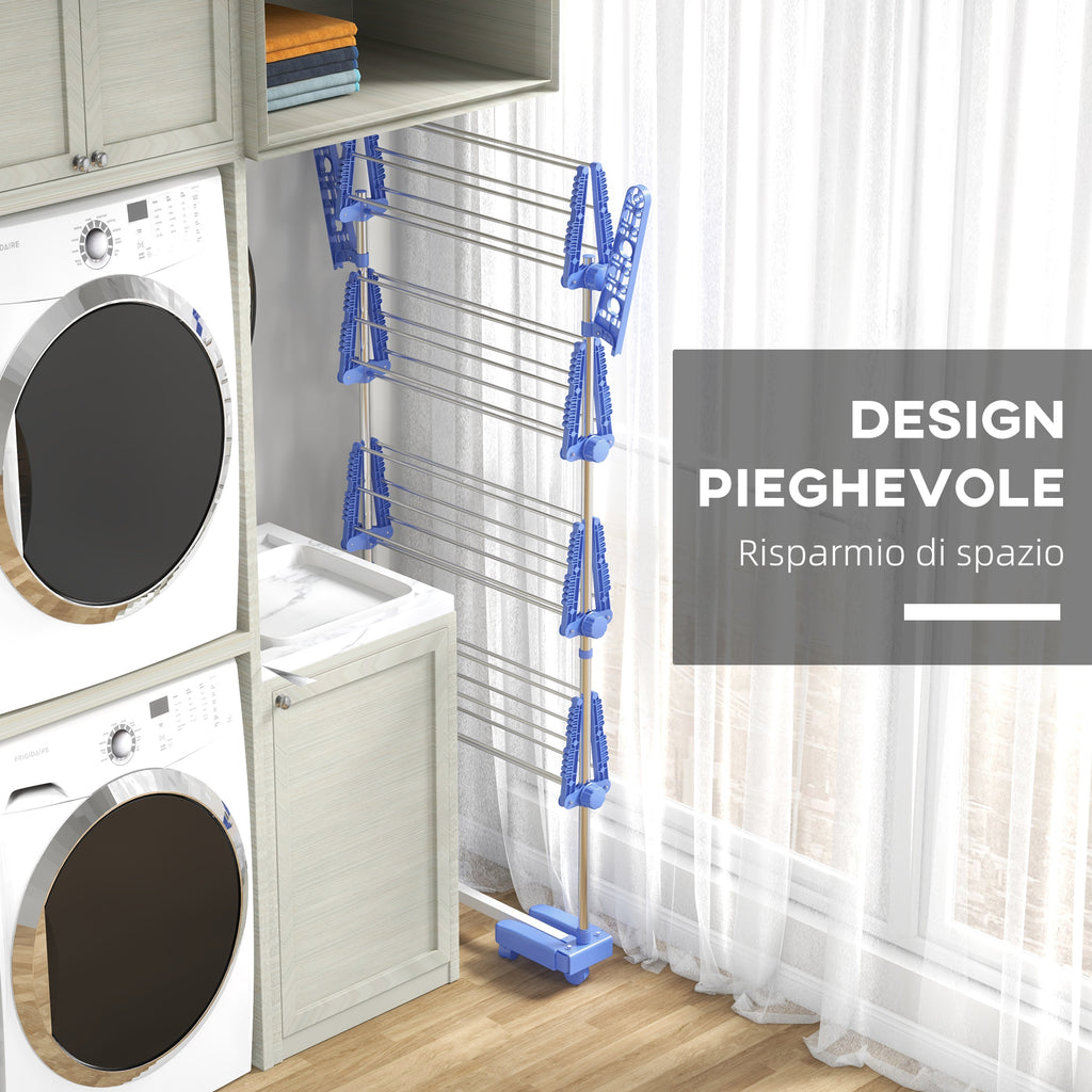 Stendino Verticale con 4 Ripiani Regolabili 142x55x172 cm in Acciaio e Plastica Blu e Argento