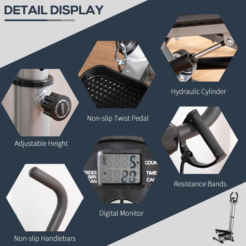 - MATERIALI DI QUALITÀ: Lo stepper con manubrio è realizzato con una solida struttura in acciaio rinforzato e due cilindri idraulici con resistenza regolabile, che assicurano un movimento fluido e stabile. I due ampi pedali offrono tanto spazio per appoggiare i piedi ed eseguire un allenamento sicuro.