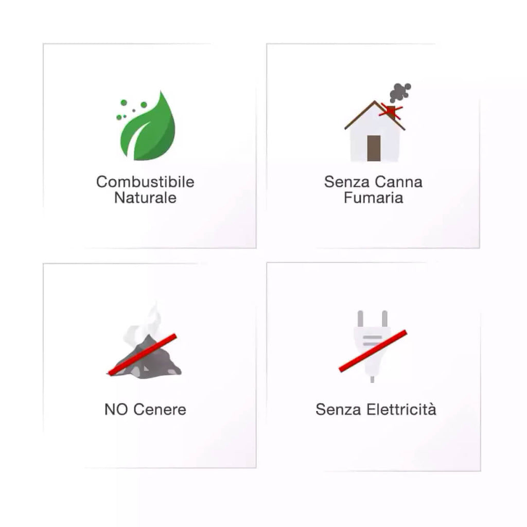 Dotato di un bruciatore a norma con lana di roccia all'interno capacità del serbatoio 2.70 LT DI BIOETANOLO.