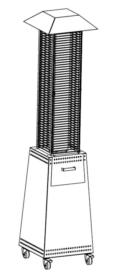 Fungo in acciaio verniciato. Un ampio e lungo vetro ceramico (diametro 16 cm) ospita la fiamma di oltre 70 cm di altezza. Il traliccio è apribile per consentire la pulizia del tubo in vetro, dopo averlo rimosso con cautela.