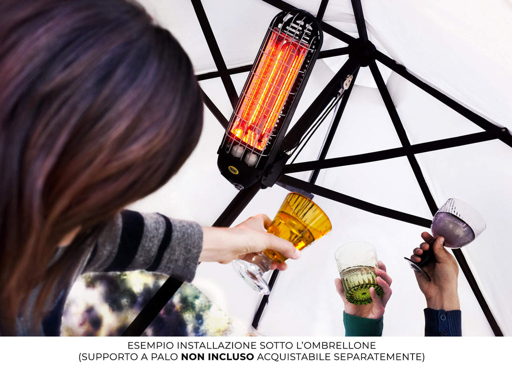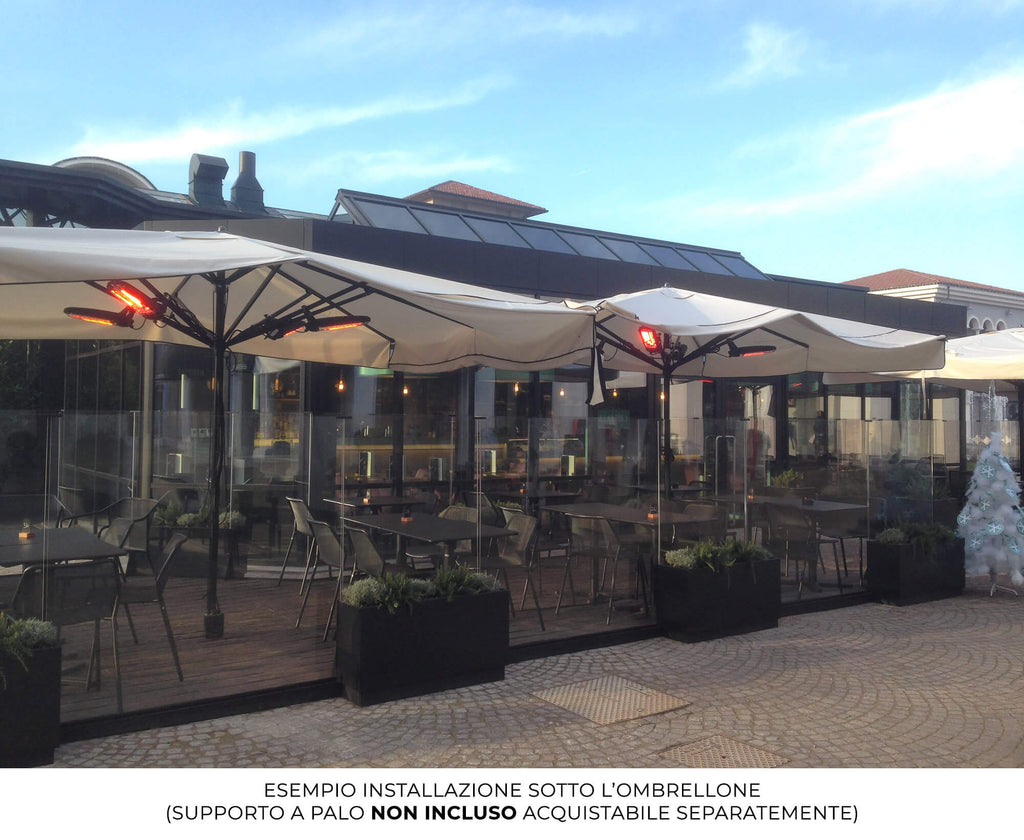 Lucciola è un riscaldatore a infrarossi unico, compatto, leggero e versatile. Lucciola è l'unica lampada concepita per l'installazione direttamente sotto gli ombrelloni o Palo (Supporto NON INCLUSO), e a parete (Supporto incluso).