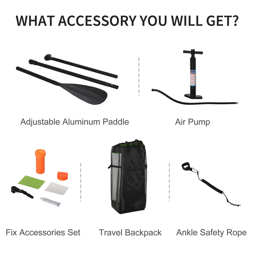 - ACCESSORI INCLUSI: Tutti gli accessori di cui hai bisogno sono già inclusi: - 1 x SUP, - 1 x Pagaia, - 1 x Set accessori riparazione (1 x colla, 1 x chiave Inglese, 1 x materiale), - 1 x Pompa gonfiaggio, - 1 x Custodia da viaggio, - 1 x Corda di sicurezza per la caviglia, - 1 x Manuale istruzioni.