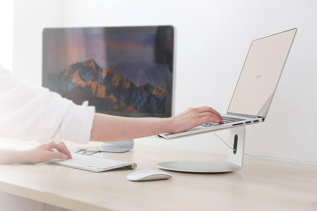 Eleva il portatile assicurando il giusto angolo di visuale, il massimo comfort per la digitazione e una corretta postura della schiena. Gli elementi antiscivolo in gomma ne garantiscono la massima stabilità. La base ruotante di 360° facilita la coindivisione dello schermo. ll foro passacavi e lo spazio sottostante consentono di liberare extra spazio sul piano di lavoro che risulta più ordinato e organizzato. La struttura in alluminio favorisce la dissipazione del calore ed evita il surriscaldamento del portatile. Compatibile con qualsiasi portatile fino a 173 .