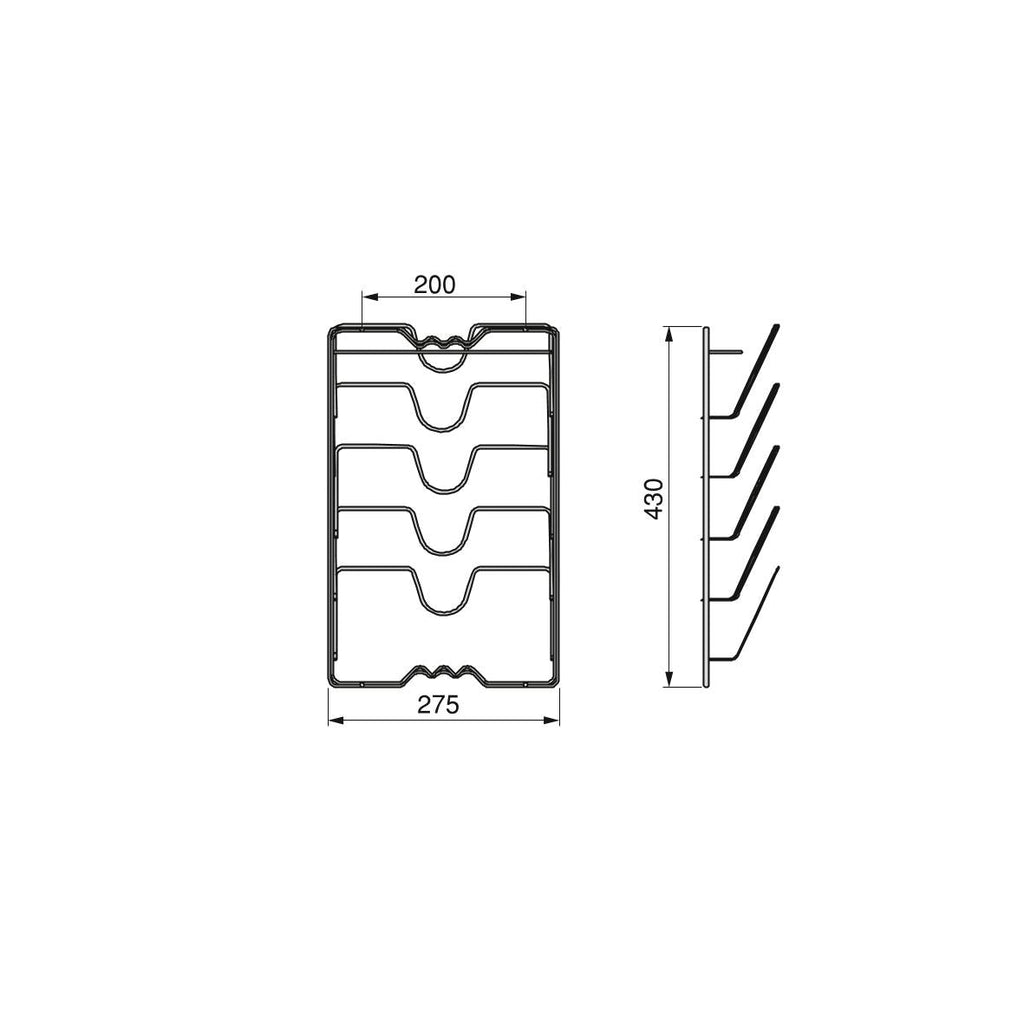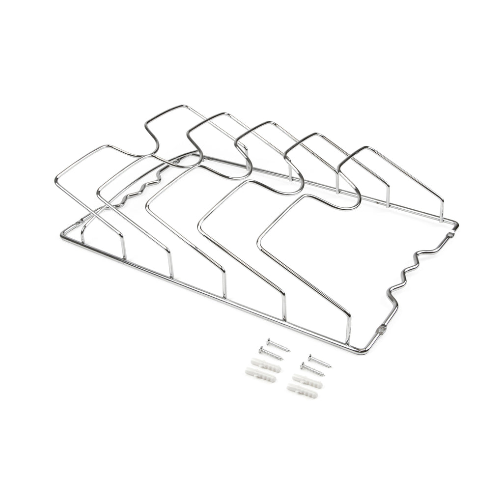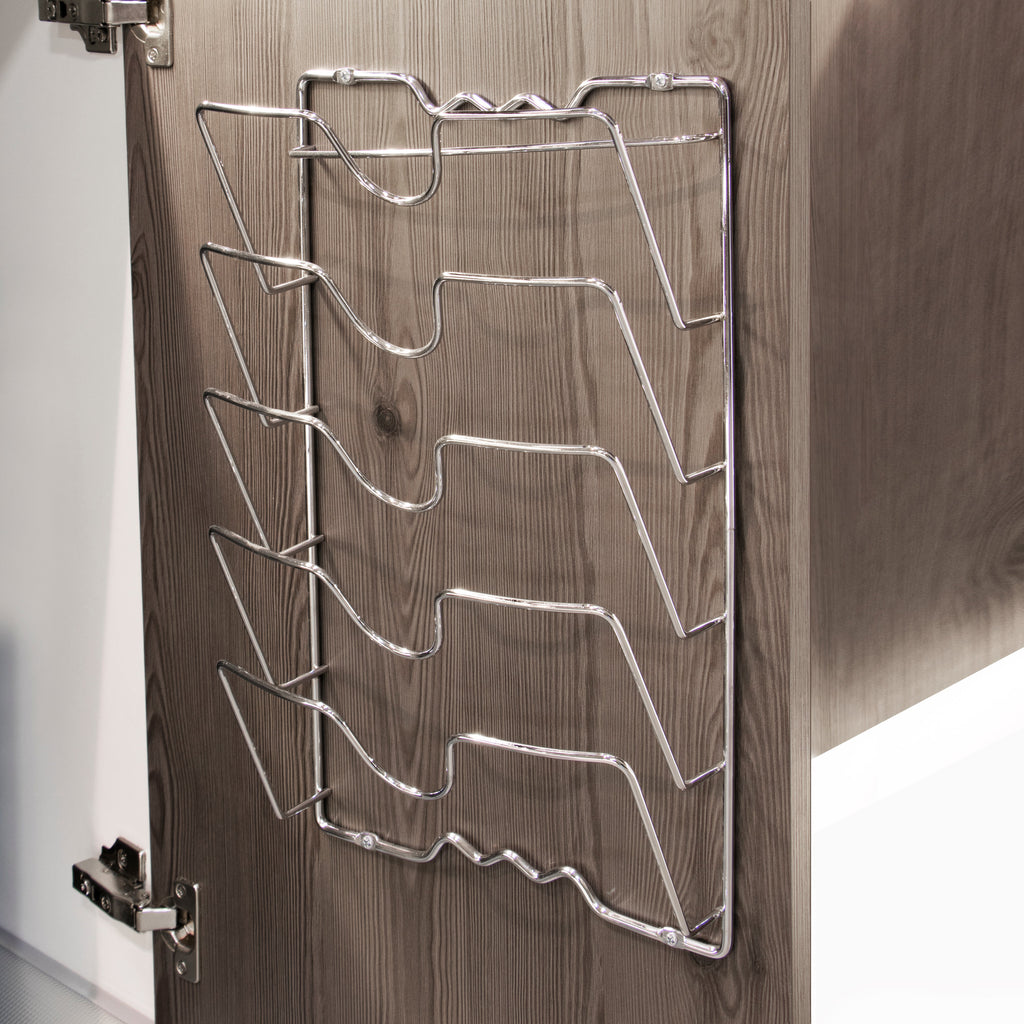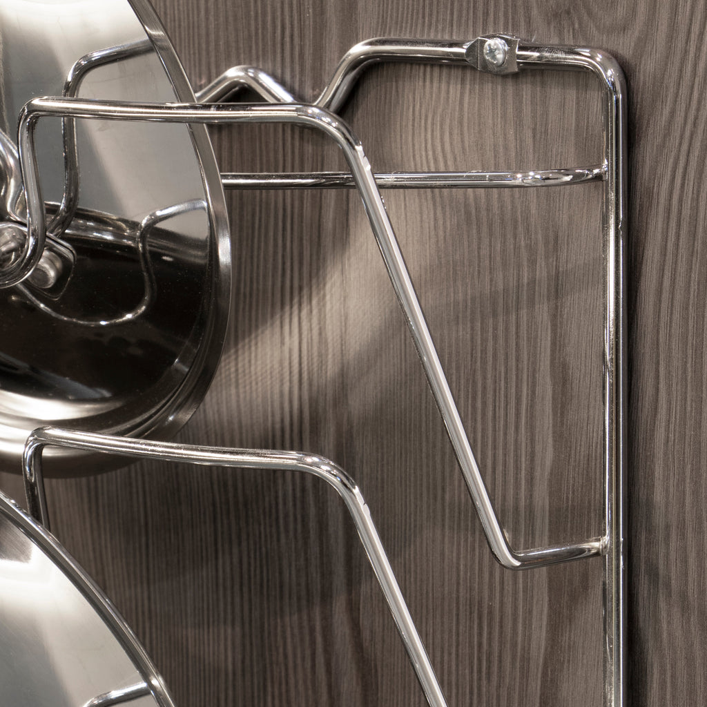 Supporto per riporre e organizzare i coperchi di pentole e padelle. Questo appendino dispone di 5 alloggi che consentono di riporre differenti tipi di coperchi. L'installazione dell'appendi coperchi può essere realizzata nella porta dei mobili della cucina o sulla parete in modo semplice tramite 4 viti fornite in dotazione. Prodotto in bacchette di acciaio cromato.