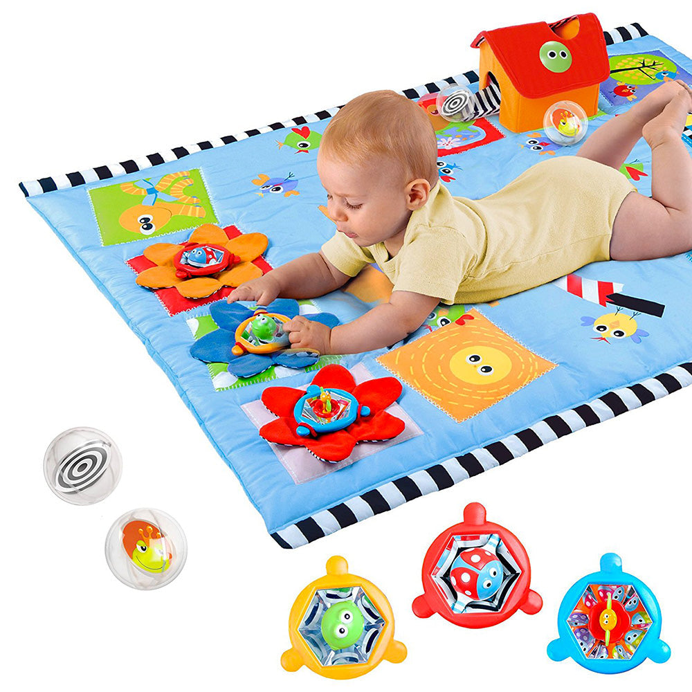Largo tappeto sul quale gattonare, girare muoversi e sperimentare. Fiori da girare, schiacciare e cliccare sviluppano le capacità motorie fini. I petali dei fiori si accartocciano sviluppando le abilità tattili mentre gli specchi all'interno esaltano il tutto. Colori brillanti e facce sorridenti stimolano l'attività visiva. 2 divertenti palline incluse. Facile da piegare, trasportare e riporre nei cassetti, tutte le parti applicate sul tappeto sono staccabili per essere lavate.