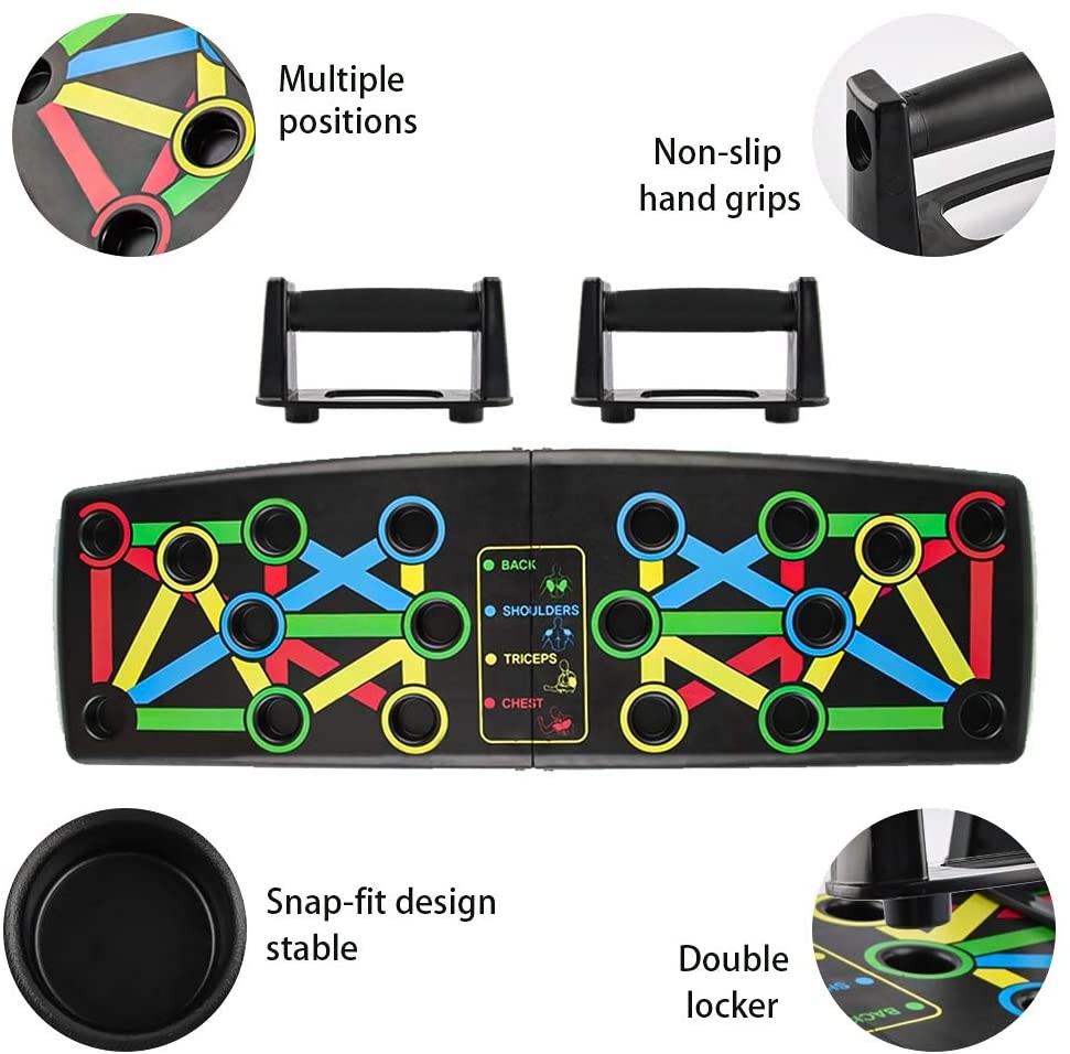 Questa tavola per flessioni aiuta a modellare ed esercitare il petto, le spalle, la schiena, i tricipiti e bicipiti, puoi utilizzarla ovunque tu ti trova.