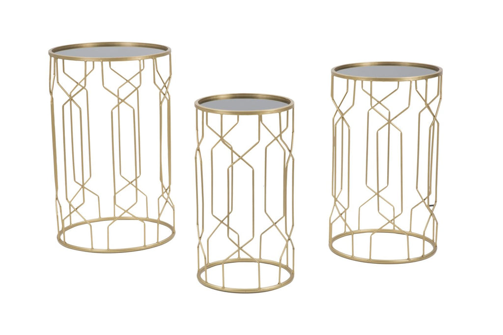 Tris di tavolinetti rotondi in metallo dorato con piano in vetro specchiato. Un tocco d'oro non può mancare in una casa glam. Il tris di tavolinetti è un elemento che diventa un punto luce in ogni ambiente