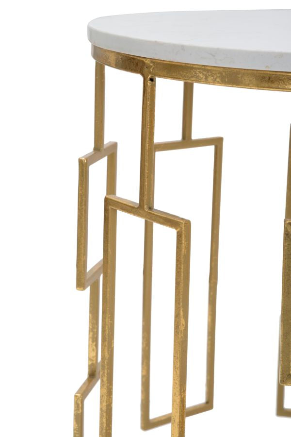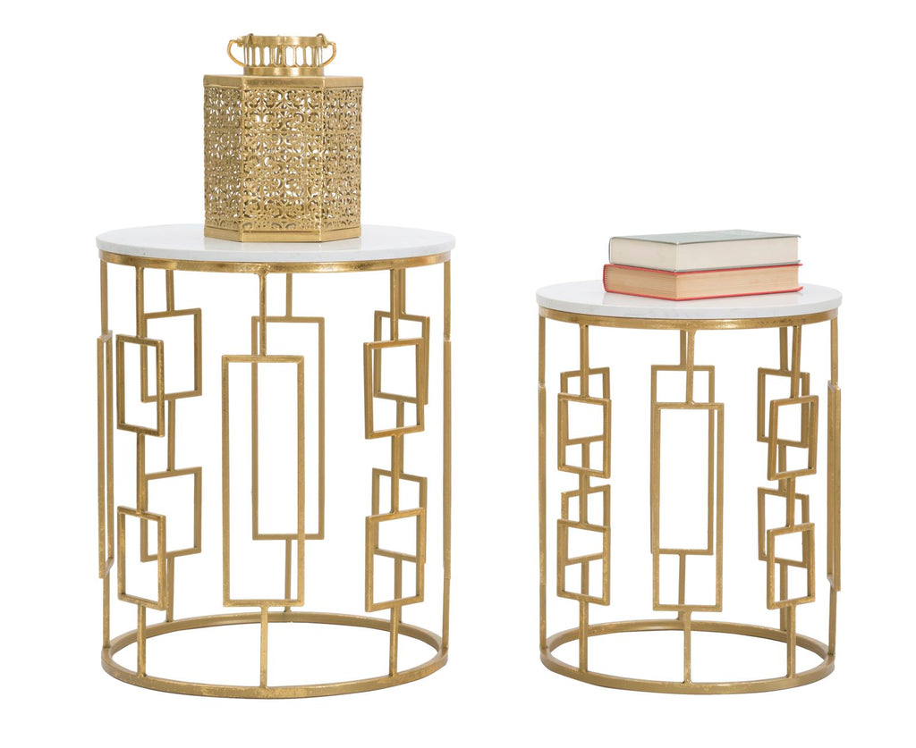 Coppia di tavolinetti rotondi in metallo dorato con piano in marmo bianco. Le decorazioni geometriche che compongono la base donano un tocco di ricercatezza ad ogni ambiente.
