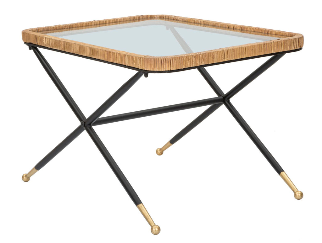 Tavolo da caffè rettangolare con struttura in metallo nero e piano in vetro con angoli smussati incorniciato in un intreccio di rattan. Particolare è la finitura delle gambe con la parte inferiore dorata. Il design semplice ma accattivante lo rende un complemento perfetto per ogni tipologia di arredo.