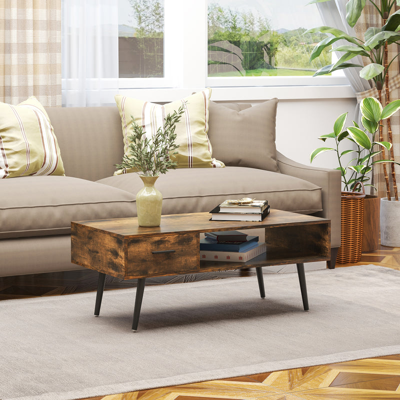 Tavolo da salotto con stile vntage attira i vostri occhi per la prima volta che la vedrete! Superficie in legno originale con gambe in legno di gomma, vi darà un'esperienza visiva e d'uso diversa. Inoltre è molto pratico con 1 cassetto, 1 scaffale portaoggetti aperto e un grande superficie di tavolino. Non esitate più, vi piacerà!
