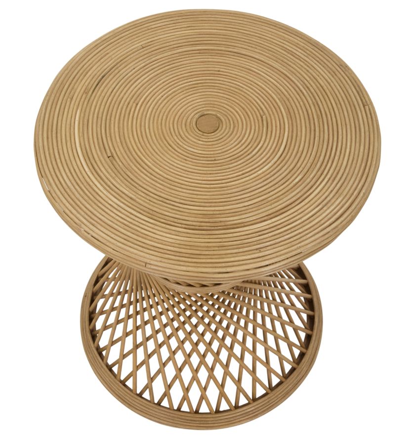 Tavolo basso rotondo in rattan, il particolare intreccio della struttura dona un ipnotico tocco di eleganza ad ogni ambiente.