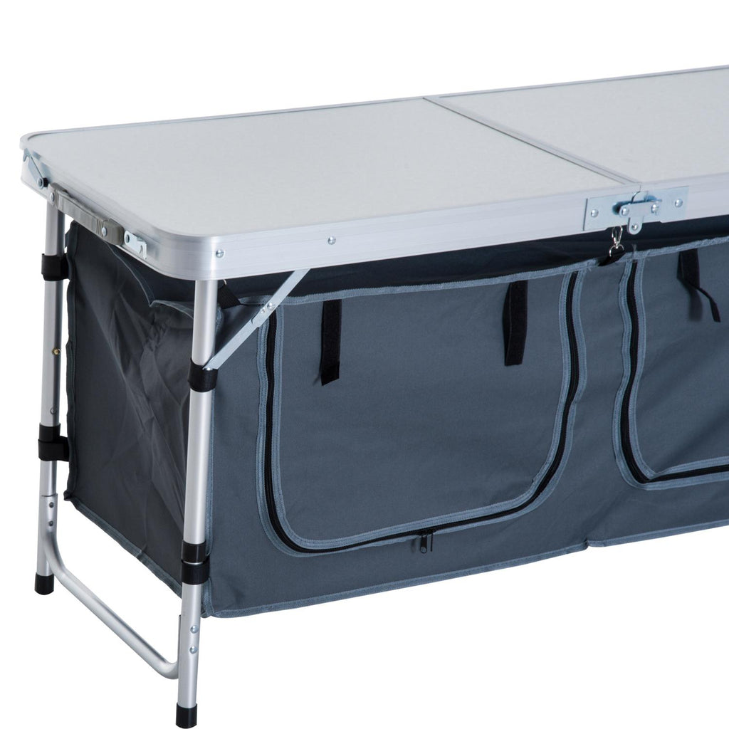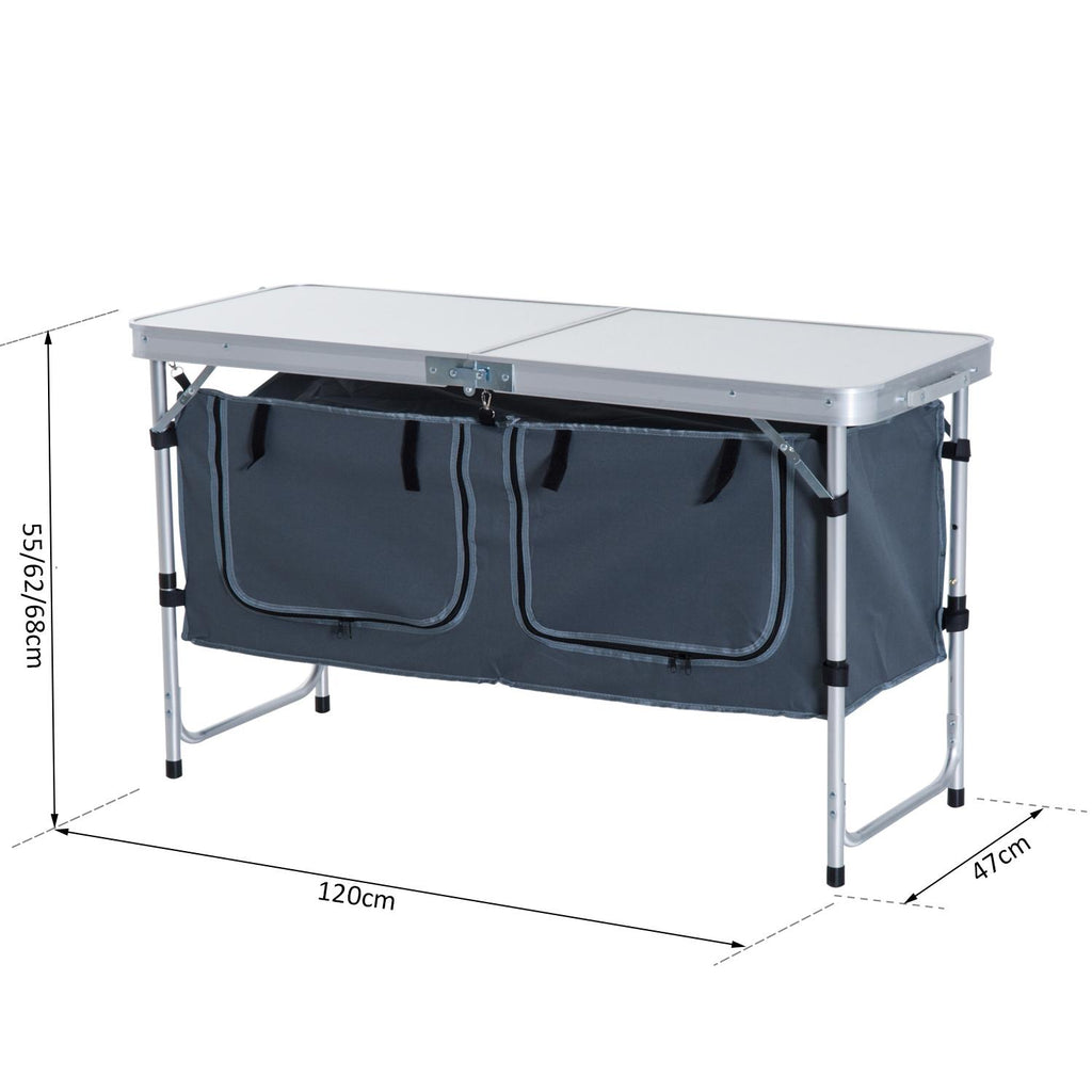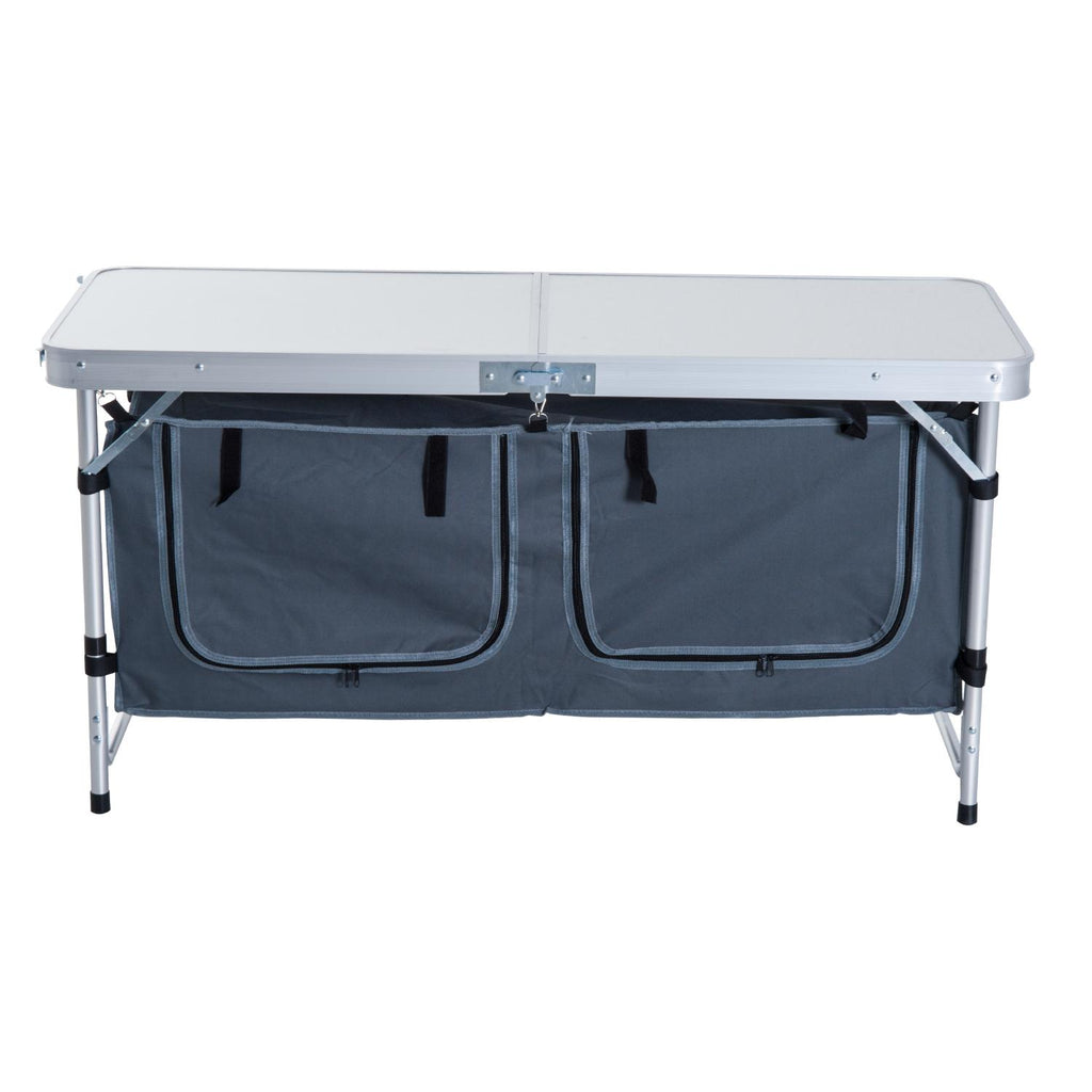 Tavolo da campeggio con struttura in lega di alluminio con piano in MDF massiccio che può sostenere fino a 25 kg di peso.