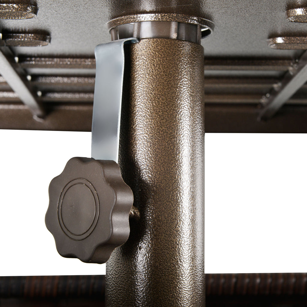 Il tavolo da giardino in rattan è un arredo funzionale ed elegante per i tuoi ambienti all'aperto. Il ripiano in acciaio è impermeabile, resistente alle macchie e facile da pulire. La cesta inferiore ti permette di riporre e tenere a portata di mano tutto ciò di cui hai bisogno. Il foro centrale ti permette di inserire comodamente un ombrellone per ripararti dal sole e goderti il tuo giardino. Questo tavolo da esterno è il complemento perfetto per il tuo arredamento da giardino.