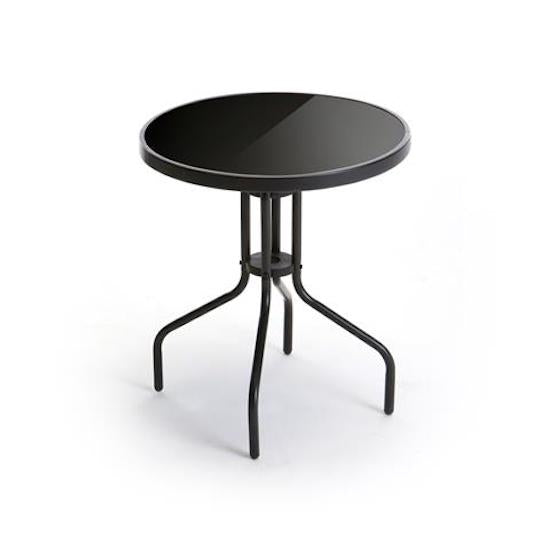Tavolino rotondo con 4 gambe, struttura in Ferro verniciata a polvere colore nero (finitura opaca), piano d'appoggio in vetro temperato spessore mm. 5 colore nero, misura d. cm 60 X h70, sezione tubolari d. mm 22 X 1.0Tavolino da Giardino Rotondo in Ferro con Piano in Vetro Taddei Maia Nero