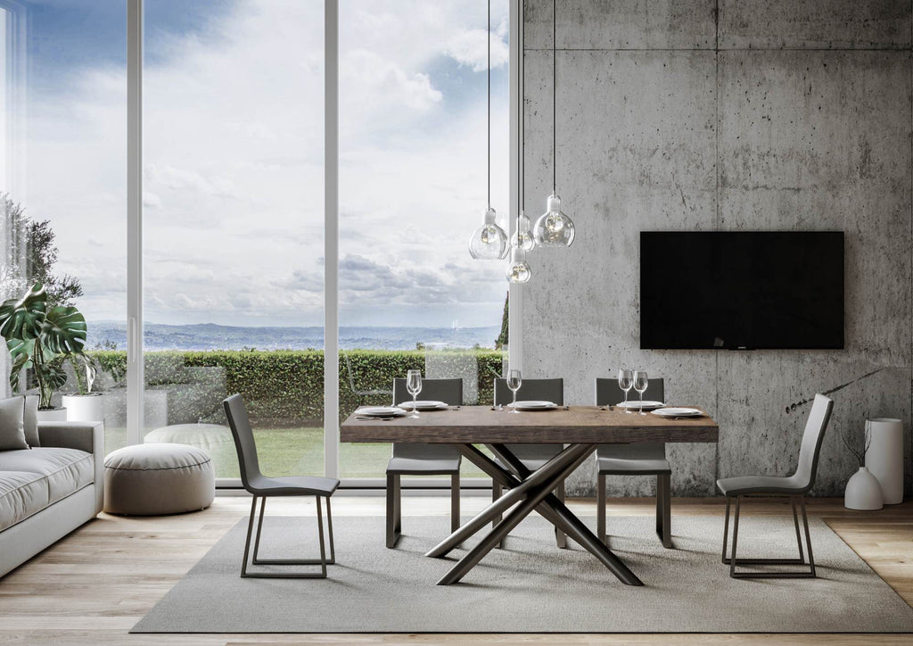 Tavolo da pranzo fisso 160x90 con gambe tubolari intrecciate tra loro a forma cilindrica. Piano in microparticelle di legno disponibile in vari colori con lavorazione a Folding con bordo h. 8 cm. Realizzata interamente in Italia mediante l'utilizzo di materiali 100% italiani.