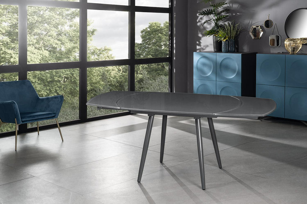Tavolo allungabile dal design unico. Con una leggera pressione basta fare ruotare la piana per allungare il tavolo.