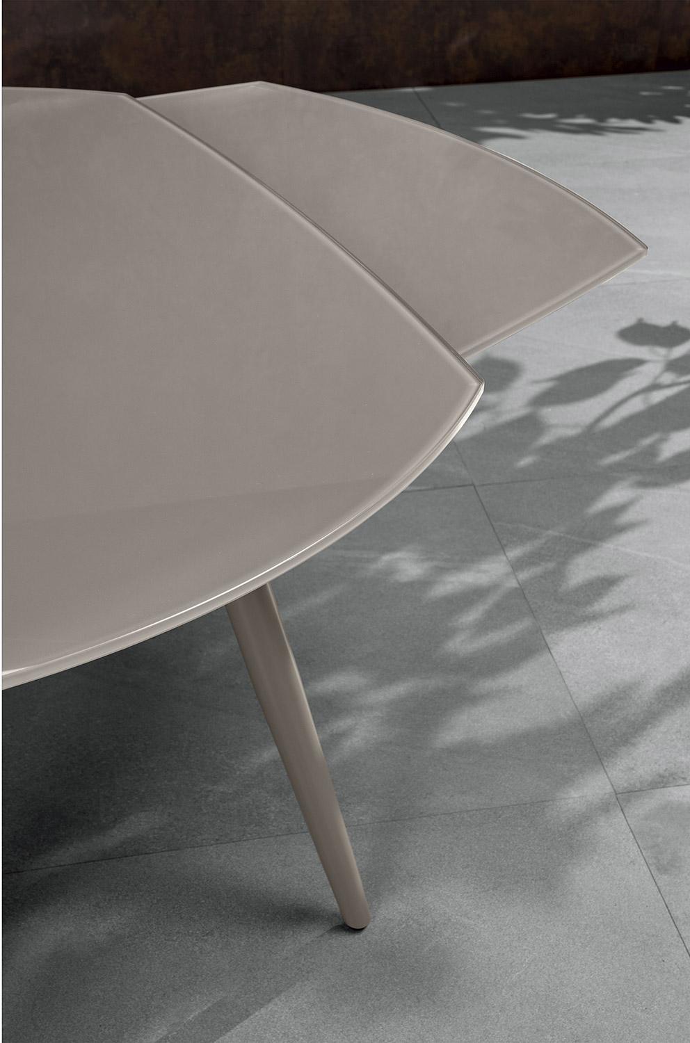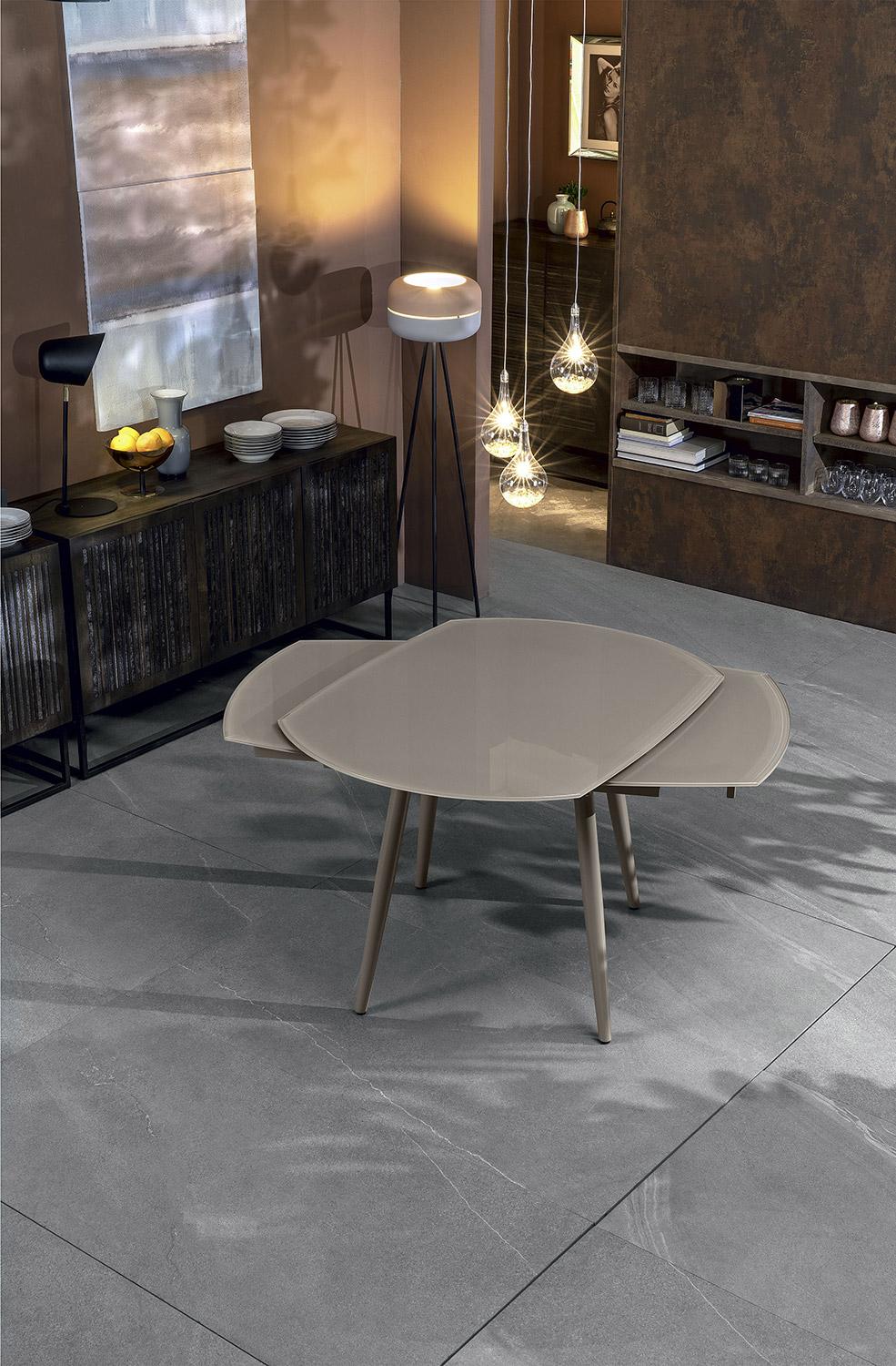 Tavolo allungabile dal design unico. Con una leggera pressione basta fare ruotare la piana per allungare il tavolo.