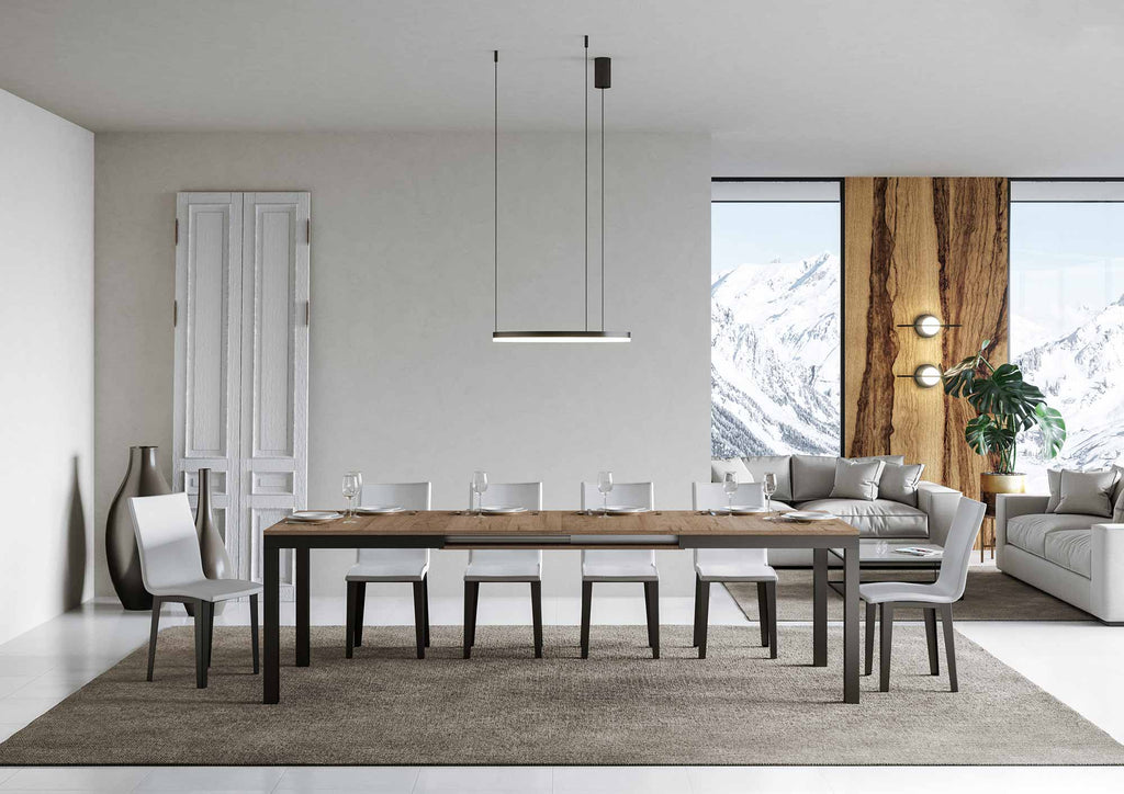 Il Tavolo Everyday Evolution 120 Allungabile fino a 380 cm è una linea dallo stile stravagante e raffinato, grazie alle particolari decorazioni delle gambe. Le gambe e il telaio sottopiano in ferro verniciato è in grado di garantire solidità alla struttura, anche quando completamente esteso. Si adatta ad ogni esigenza di spazio, grazie al particolare sistema di allunghe che gli permette di estendersi fino a 380 cm. Il Tavolo Everyday Evolution ha due allunghe alloggiate sotto il piano, pronte all'utilizzo, le altre tre sono da riporre in altro luogo quando non utilizzate. Made in Italy con materiali 100% italiani.