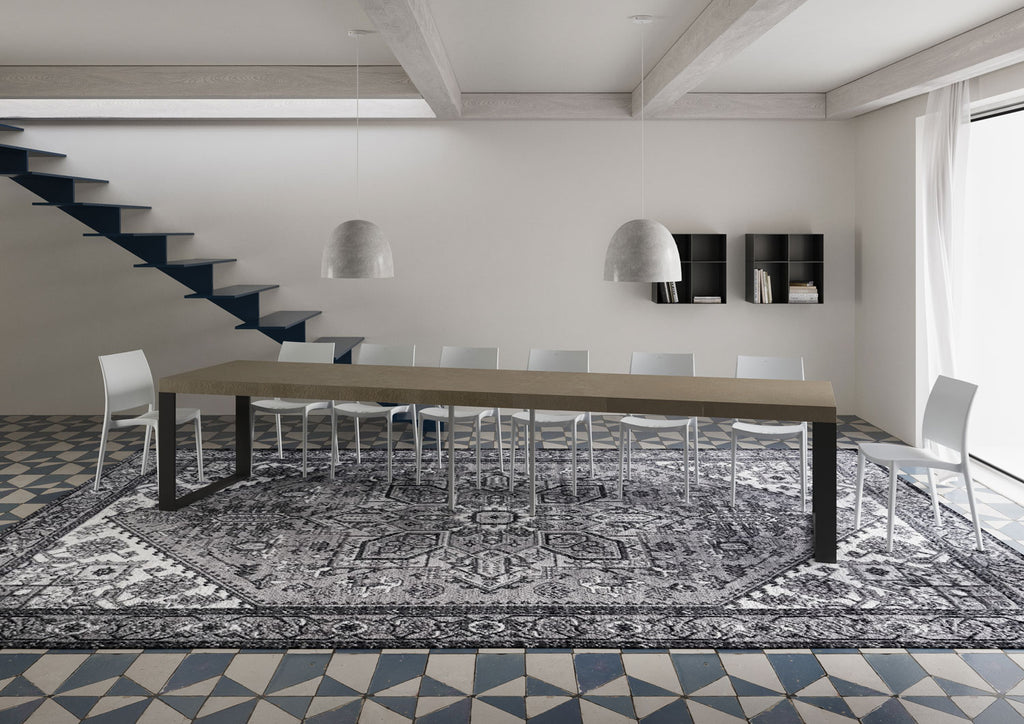 Tavolo allungabile Tecno Premium da 120 cm, dal design lineare, semplice ed essenziale, si adatta a qualsiasi stile di arredamento e si rivela la scelta ideale sia come tavolo da pranzo che come elemento d'arredo per il soggiorno, dove poter accogliere i propri ospiti con stile. Il tavolo allungabile Tecno Premium è in grado di estendersi progressivamente fino a 380 cm capace di ospitare 16 persone. Realizzato con pannelli in nobilitato, gambe in ferro, piano e allunghe con lavorazione a Folding. Il sistema di estensione con guide telescopiche in alluminio rende il tavolo stabile e robusto anche se totalmente allungato, senza bisogno di ulteriori sostegni. Quando non utilizzate, le allunghe non trovano collocamento all’interno della struttura del tavolo e vanno quindi riposte altrove.