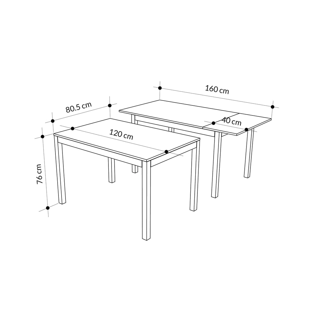 - Misure del tavolo 120x80 cm o 160x80 cm con l'allunga