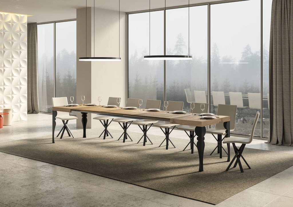 Tavolo allungabile Paxon da 140 cm, dal design moderno dallo stile ricercato e stravagante, si adatta a qualsiasi stile di arredamento e si rivela la scelta ideale sia come tavolo da pranzo che come elemento d'arredo per il soggiorno, dove poter accogliere i propri ospiti con stile. Il tavolo allungabile Paxon è in grado di estendersi progressivamente fino a 400 cm capace di ospitare 18 persone. Realizzato con pannelli in nobilitato, gambe in ferro, piano con lavorazione a Folding. Il sistema di estensione con guide telescopiche in alluminio rende il tavolo stabile e robusto anche se totalmente allungato, senza bisogno di ulteriori sostegni. Due allunghe sono alloggiate sotto il piano pronte all'utilizzo mentre le rimanenti tre vanno riposte altrove.