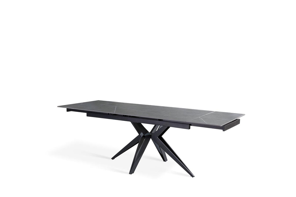 Il tavolo allungabile è caratterizzato da un elegante piano in ceramica marmo grigio, che conferisce un tocco di raffinatezza all'ambiente. Il suo opaco dona un aspetto moderno e sofisticato al tavolo. Le quattro gambe a stella in metallo nero opaco garantiscono stabilità e resistenza. Le allunghe a scomparsa, realizzate in ceramica marmo grigio, permettono di ampliare facilmente la superficie del tavolo, offrendo una maggiore versatilità nell'uso.