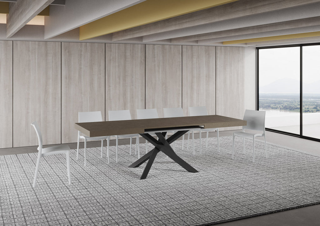 Tavolo allungabile Volantis da 160 cm, dal design moderno dallo stile sofisticato, si adatta a qualsiasi stile di arredamento e si rivela la scelta ideale sia come tavolo da pranzo che come elemento d'arredo per il soggiorno, dove poter accogliere i propri ospiti con stile. Il tavolo allungabile Volantis è in grado di estendersi progressivamente fino a 264 cm capace di ospitare 12 persone. Realizzato con pannelli in nobilitato, gambe in ferro, piano con lavorazione a Folding. Il sistema di estensione con guide telescopiche in alluminio rende il tavolo stabile e robusto anche se totalmente allungato, senza bisogno di ulteriori sostegni. Le allunghe sono immediatamente pronte all'utilizzo in quanto alloggiate sotto il piano principale.