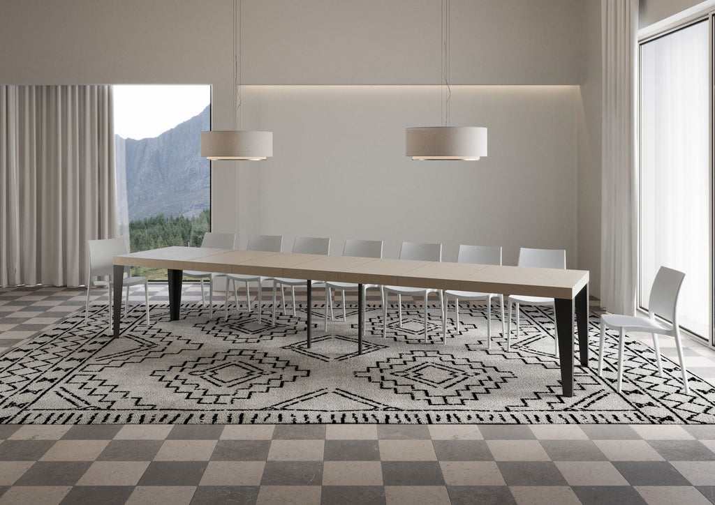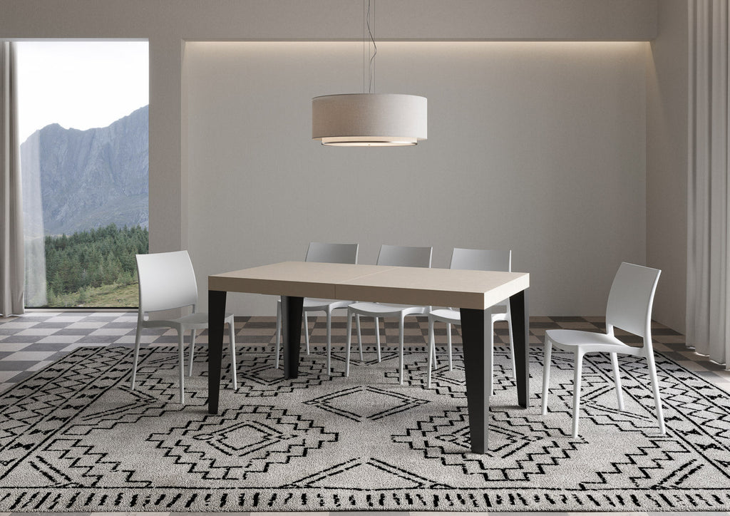 Tavolo allungabile Flame da 160 cm, dal design lineare, semplice ed essenziale, si adatta a qualsiasi stile di arredamento e si rivela la scelta ideale sia come tavolo da pranzo che come elemento d'arredo per il soggiorno, dove poter accogliere i propri ospiti con stile. Il tavolo allungabile Flame è in grado di estendersi progressivamente fino a 420 cm capace di ospitare 18 persone. Realizzato con pannelli in nobilitato, gambe in ferro, piano con lavorazione a Folding. Il sistema di estensione con guide telescopiche in alluminio e il sostegno Centrale in dotazione rendono il tavolo stabile e robusto anche se totalmente allungato. Due allunghe sono alloggiate sotto il piano pronte all'utilizzo mentre le rimanenti tre vanno riposte altrove.