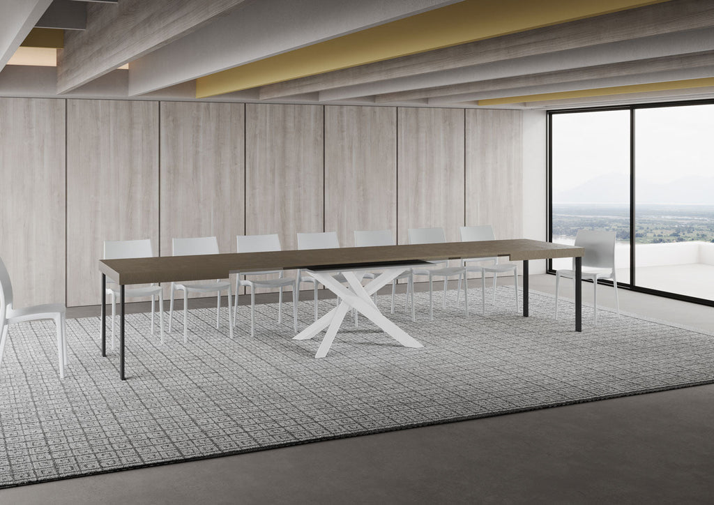 Tavolo allungabile Volantis da 160 cm, dal design moderno dallo stile sofisticato, si adatta a qualsiasi stile di arredamento e si rivela la scelta ideale sia come tavolo da pranzo che come elemento d'arredo per il soggiorno, dove poter accogliere i propri ospiti con stile. Il tavolo allungabile Volantis è in grado di estendersi progressivamente fino a 420 cm capace di ospitare 18 persone. Realizzato con pannelli in nobilitato, gambe in ferro, piano con lavorazione a Folding. Il sistema di estensione con guide telescopiche in alluminio e i sostegni laterali in dotazione rendono il tavolo stabile e robusto anche se totalmente allungato. Due allunghe sono alloggiate sotto il piano pronte all'utilizzo mentre le rimanenti tre vanno riposte altrove.
