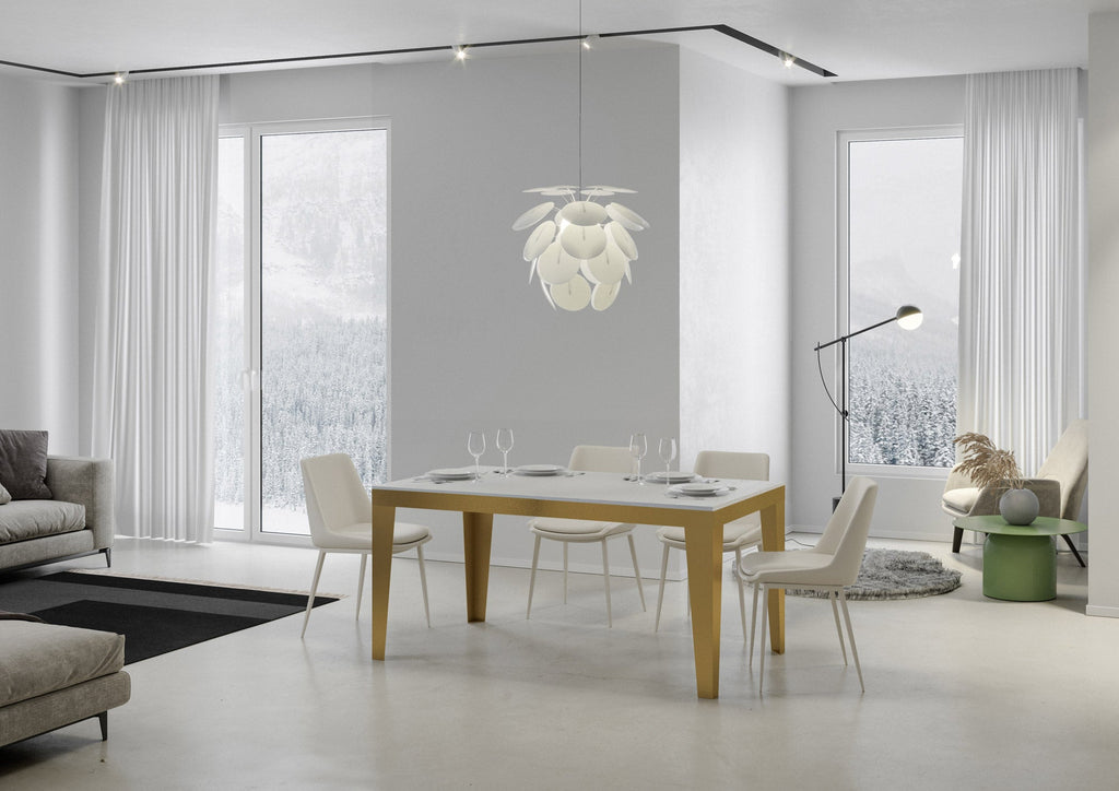 Il Tavolo Flame Evolution 180 Allungabile è una linea dallo stile stravagante e raffinato, grazie alle particolari decorazioni delle gambe. Le gambe e il telaio sottopiano in ferro verniciato è in grado di garantire solidità alla struttura, anche quando completamente esteso. Si adatta ad ogni esigenza di spazio, grazie al particolare sistema di allunghe che gli permette di estendersi fino a 284 cm. Le allunghe presentano la stessa finitura del piano sono alloggiate sotto al piano. Made in Italy con materiali 100% italiani.